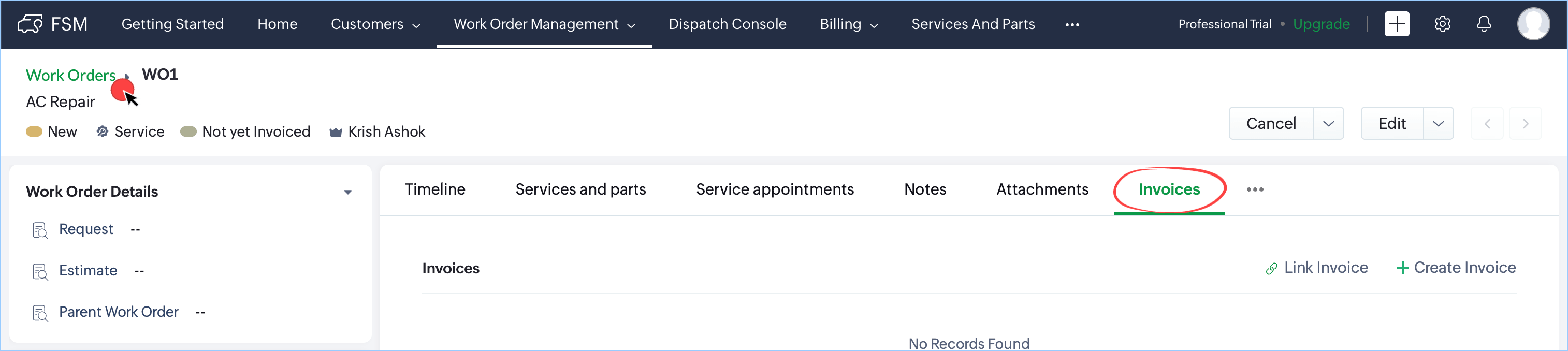 2. The Invoices tab is hidden in the Work Orders Details page.