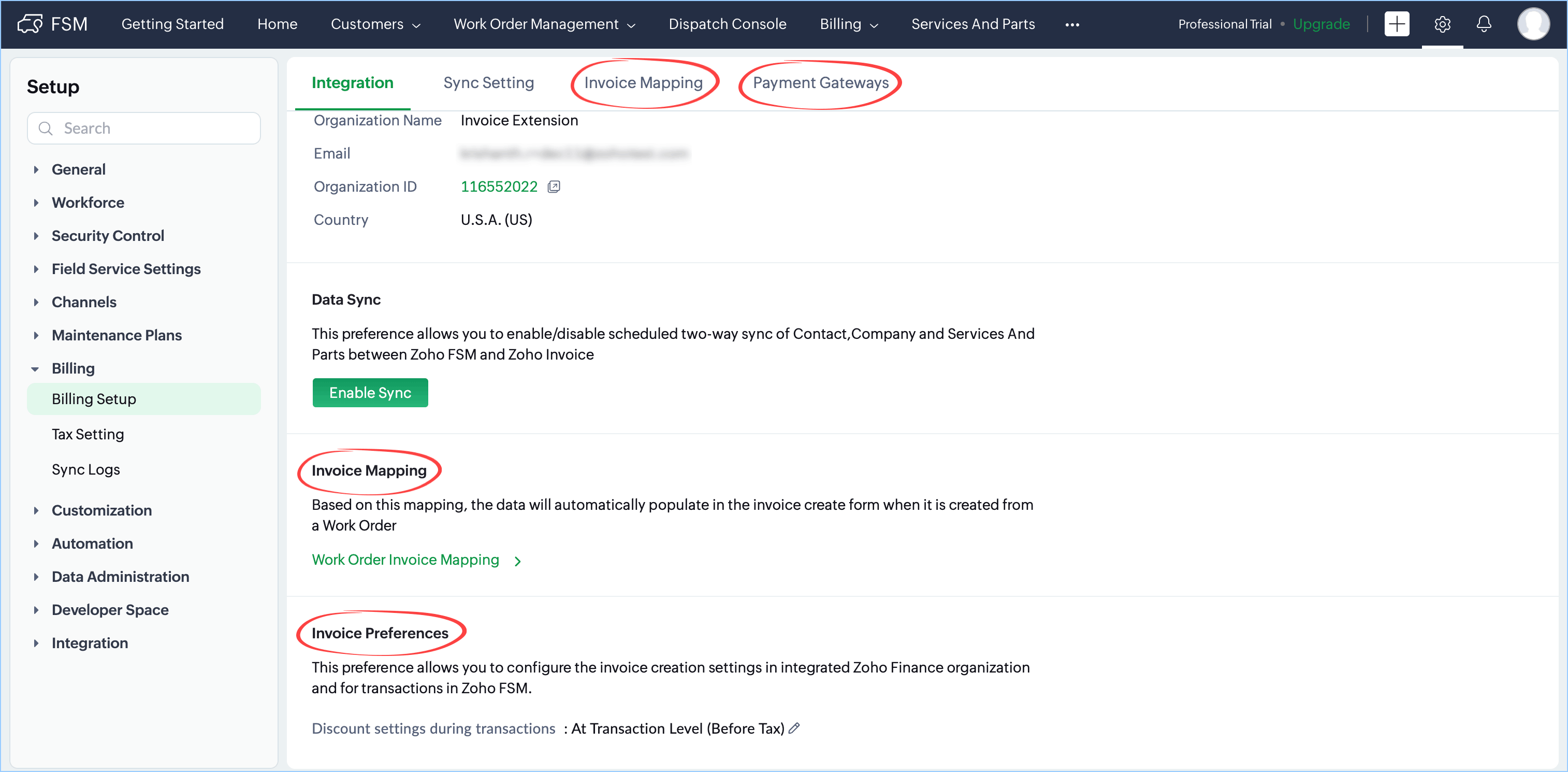 3. The Invoice Mapping and Invoice Preferences options under the Integration tab, as well as the Invoice Mapping and Payment Gateways tabs on the Billing Setup (Setup > Billing) page, will be hidden.