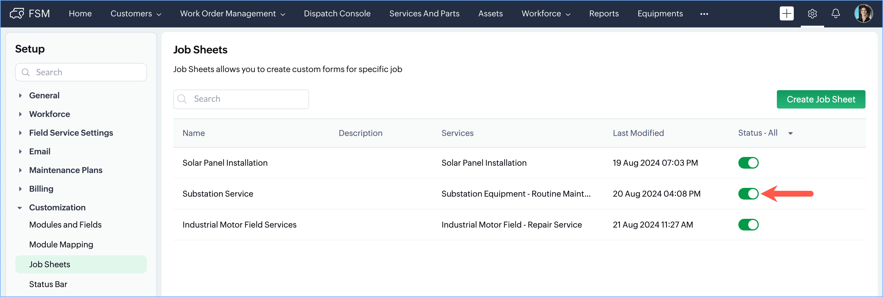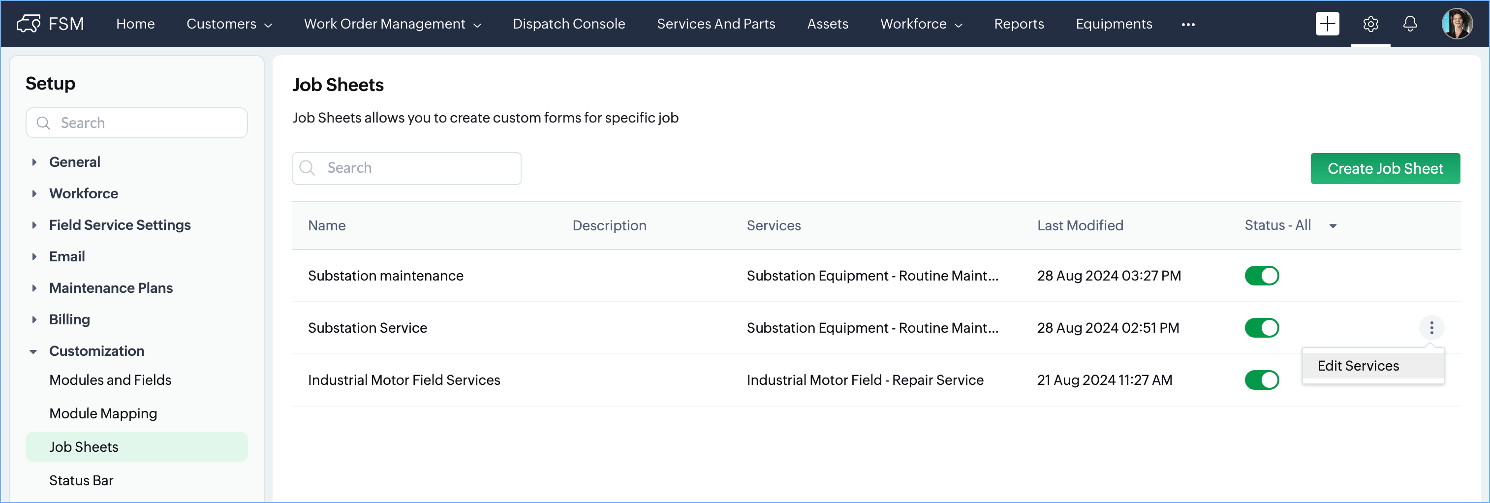 - Navigate to Setup > Customization > Job Sheets and hover over the job sheet whose services you want to edit.