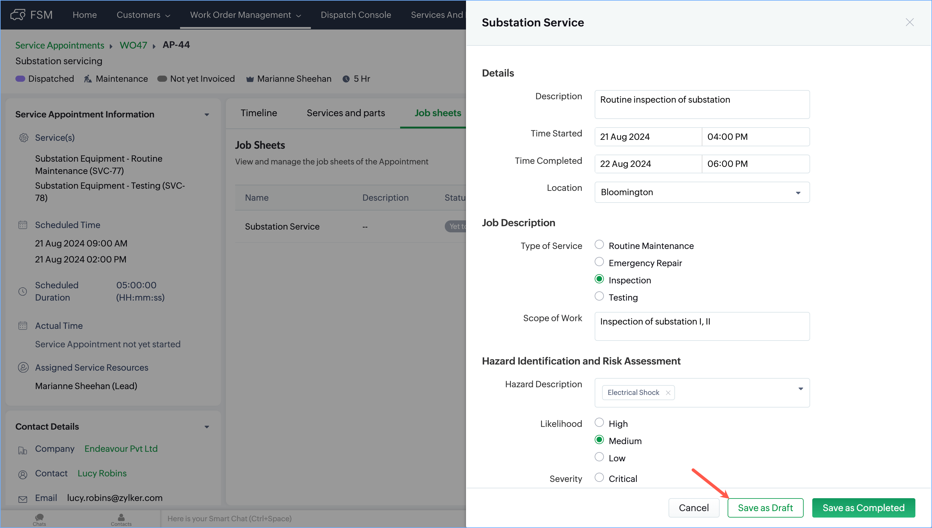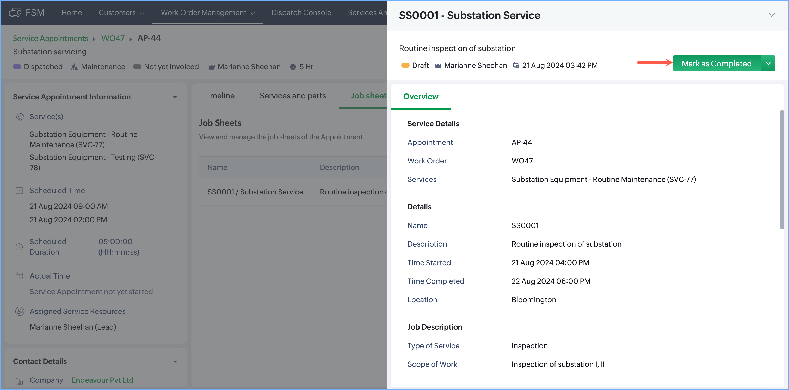 If a job sheet that you mark as inactive is already being used in a service appointment, then you can continue using it if it has already been filled, i.e., the ones with the Draft and Completed statuses. The ones in the Yet To Start status will be removed. Refer to