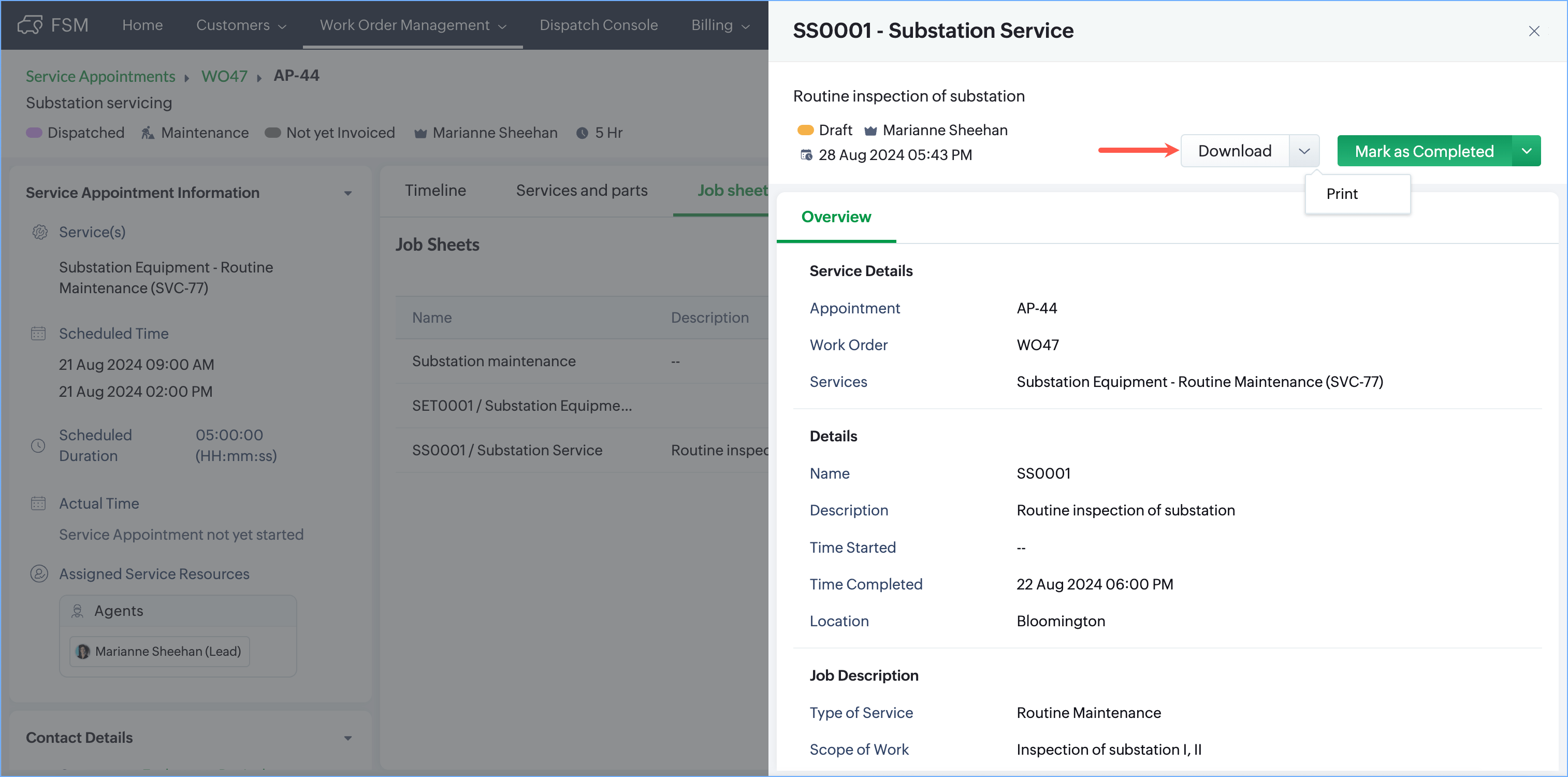 The option to download a job sheet as a PDF or print it will be available once it is in the Draft status.