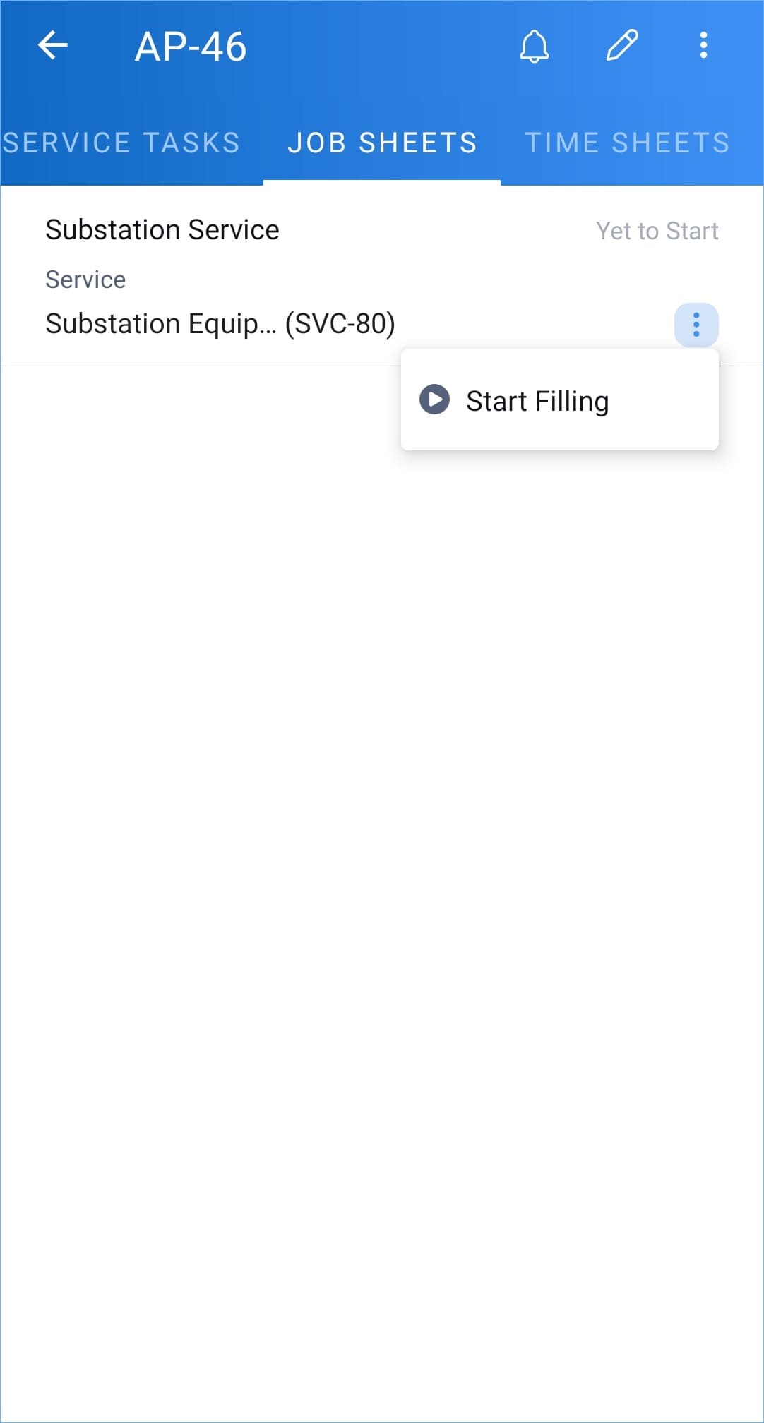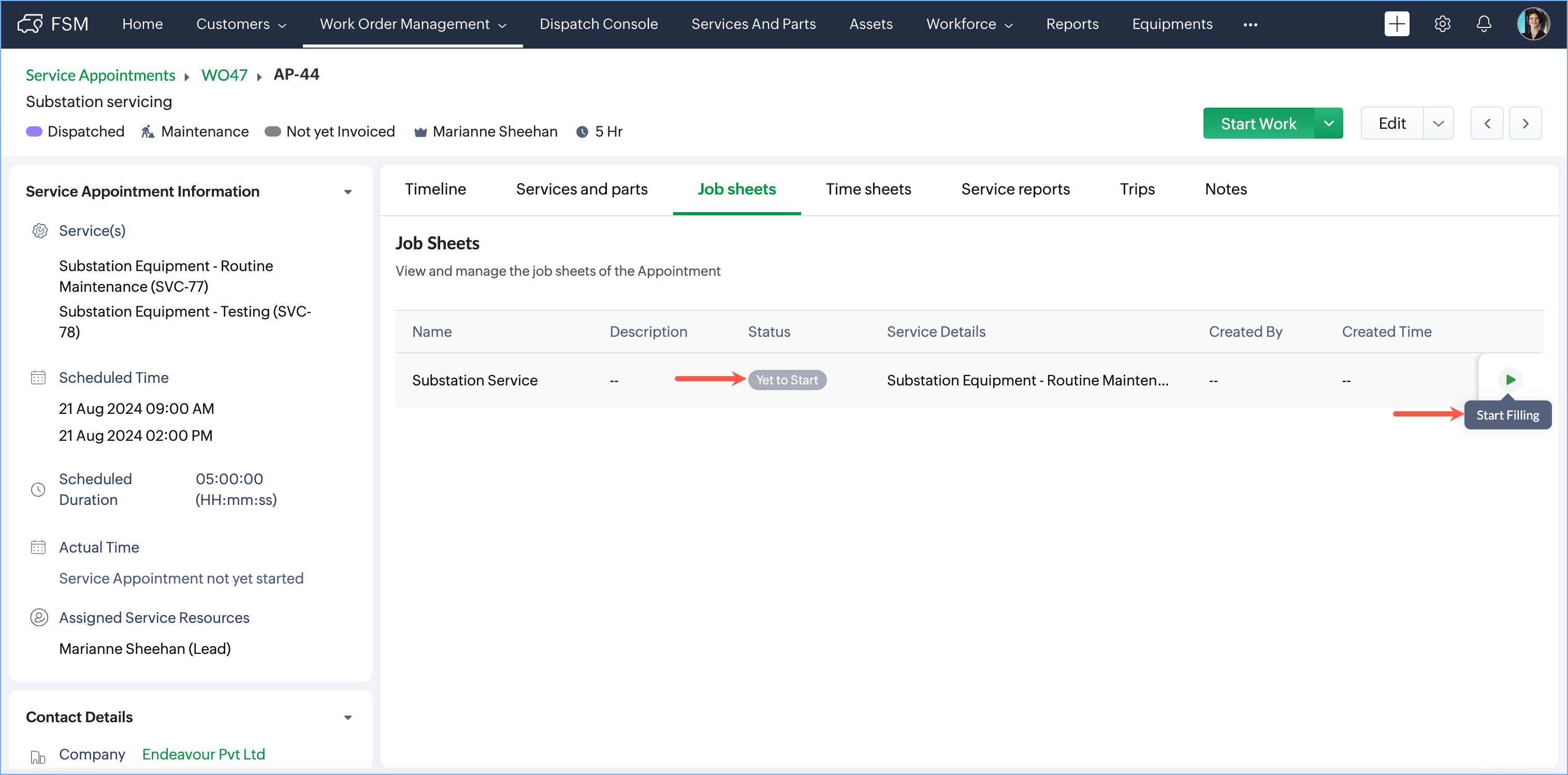 Initially, the status of the job sheet will be Yet To Start. Click on Start Filling to fill out the necessary details.