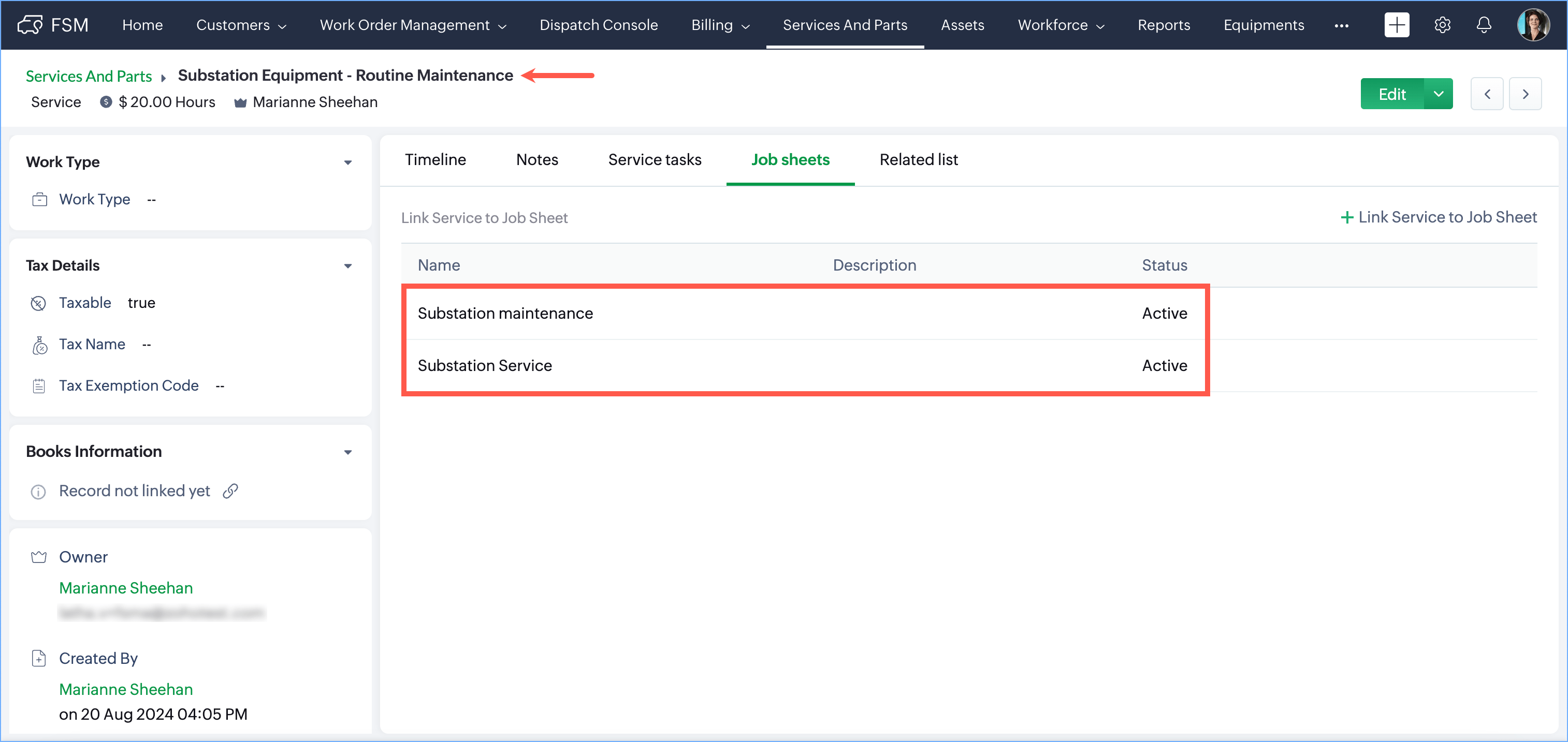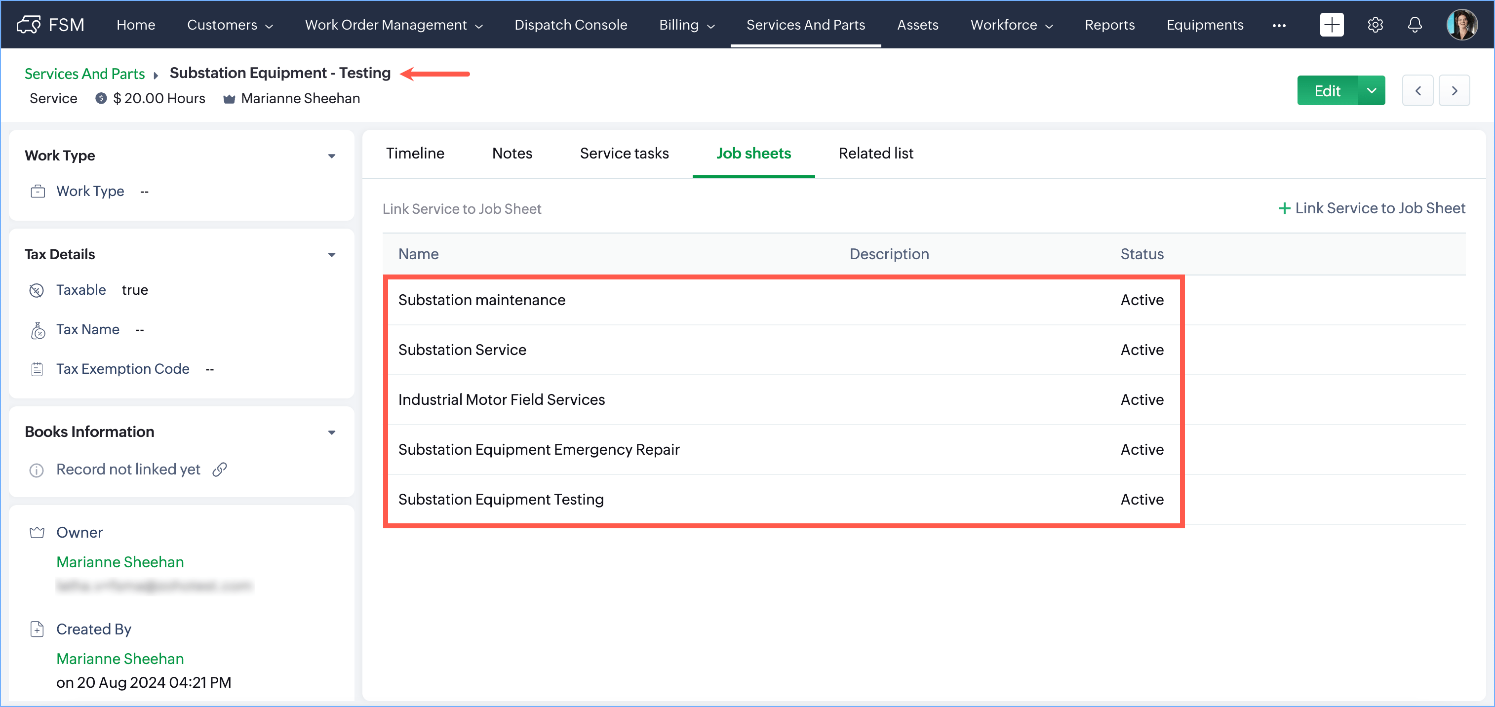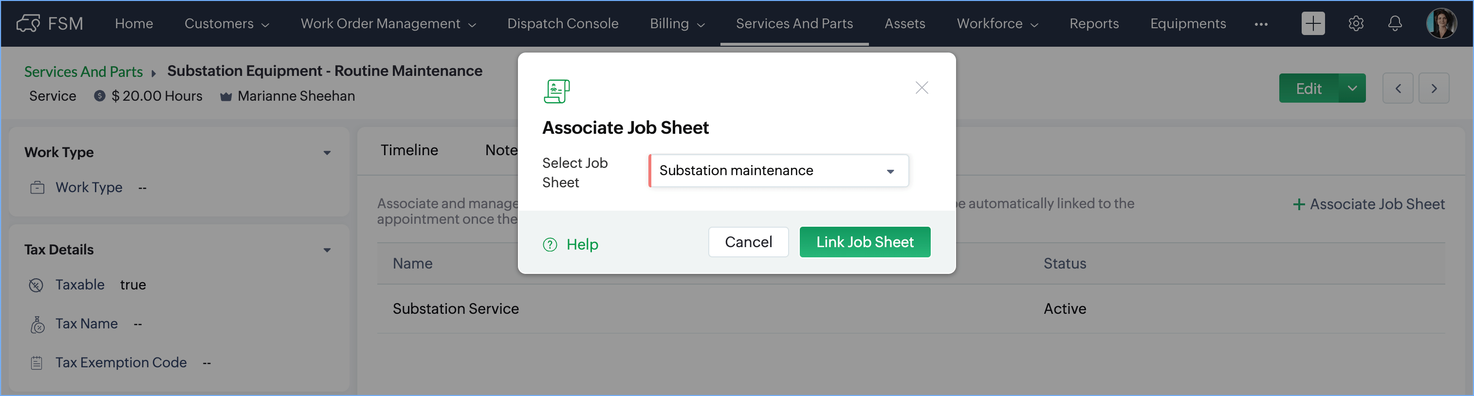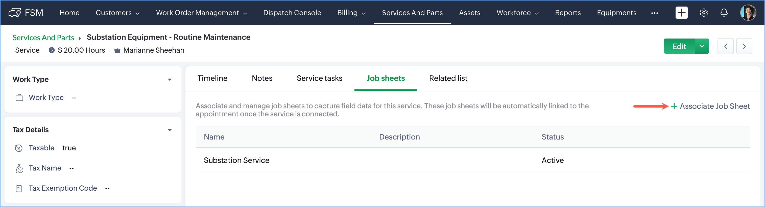 - Click on the service you want to associate with a job sheet.