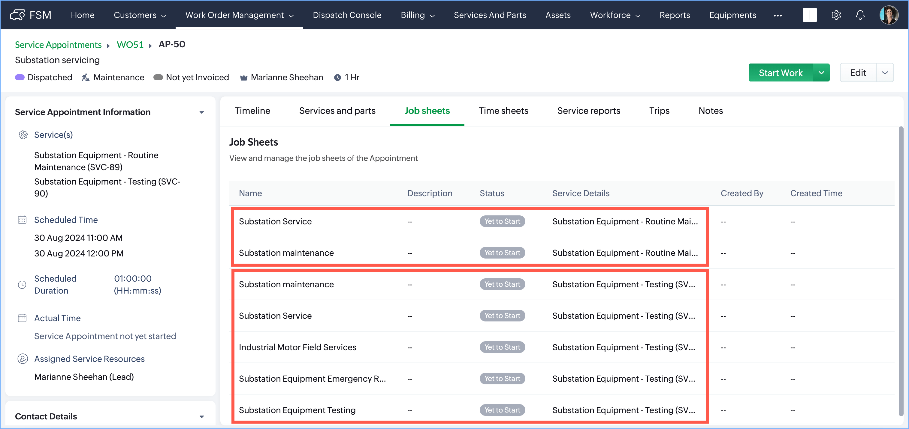 Under the Job sheets tab of the service appointment, a total of seven job sheet line items will be added, two for the service Substation Equipment - Routine Maintenance, and five for Substation Equipment - Testing and in that order.