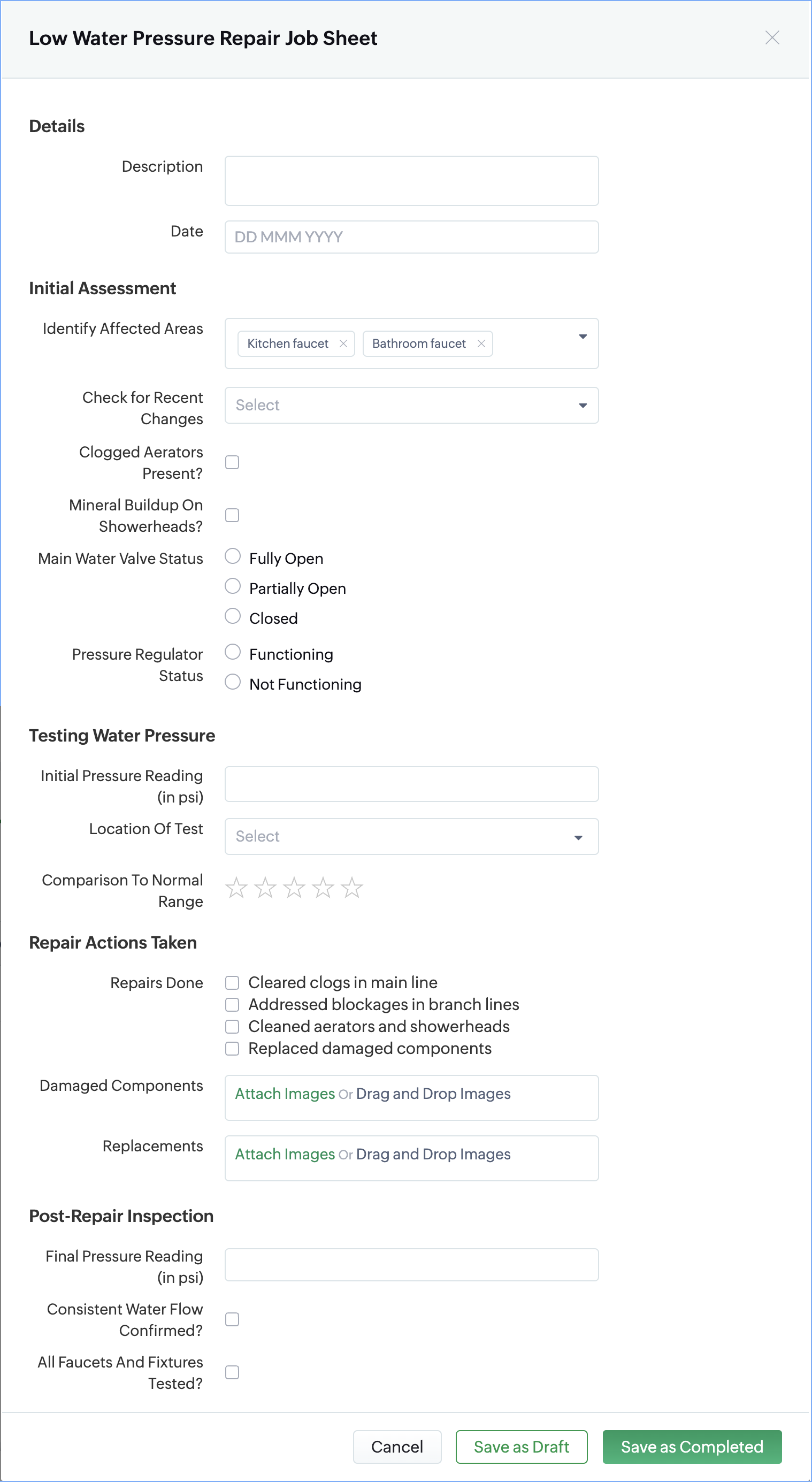 Low Water Pressure Repair Job Sheet