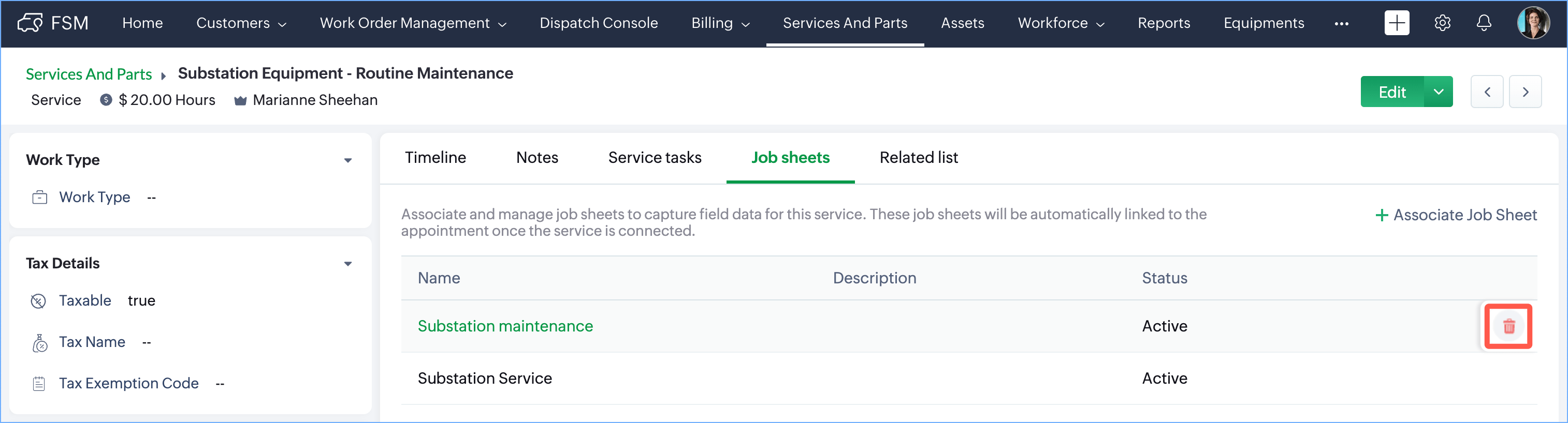 You can remove the job sheet to which you have associated the service by hovering over an entry and clicking on the