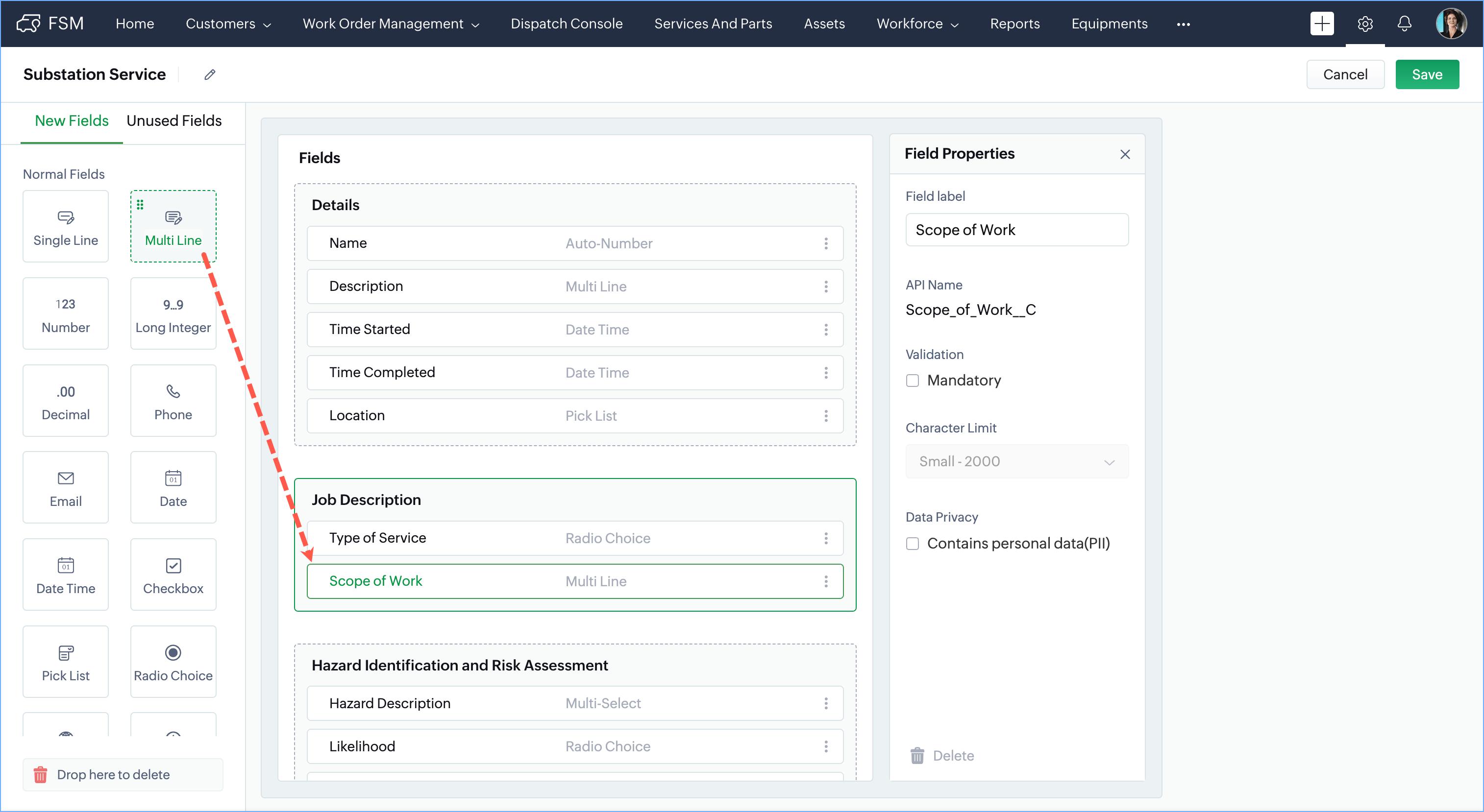 - In the Job Sheet Builder page, drag and drop the fields you want from the New Fields tray.