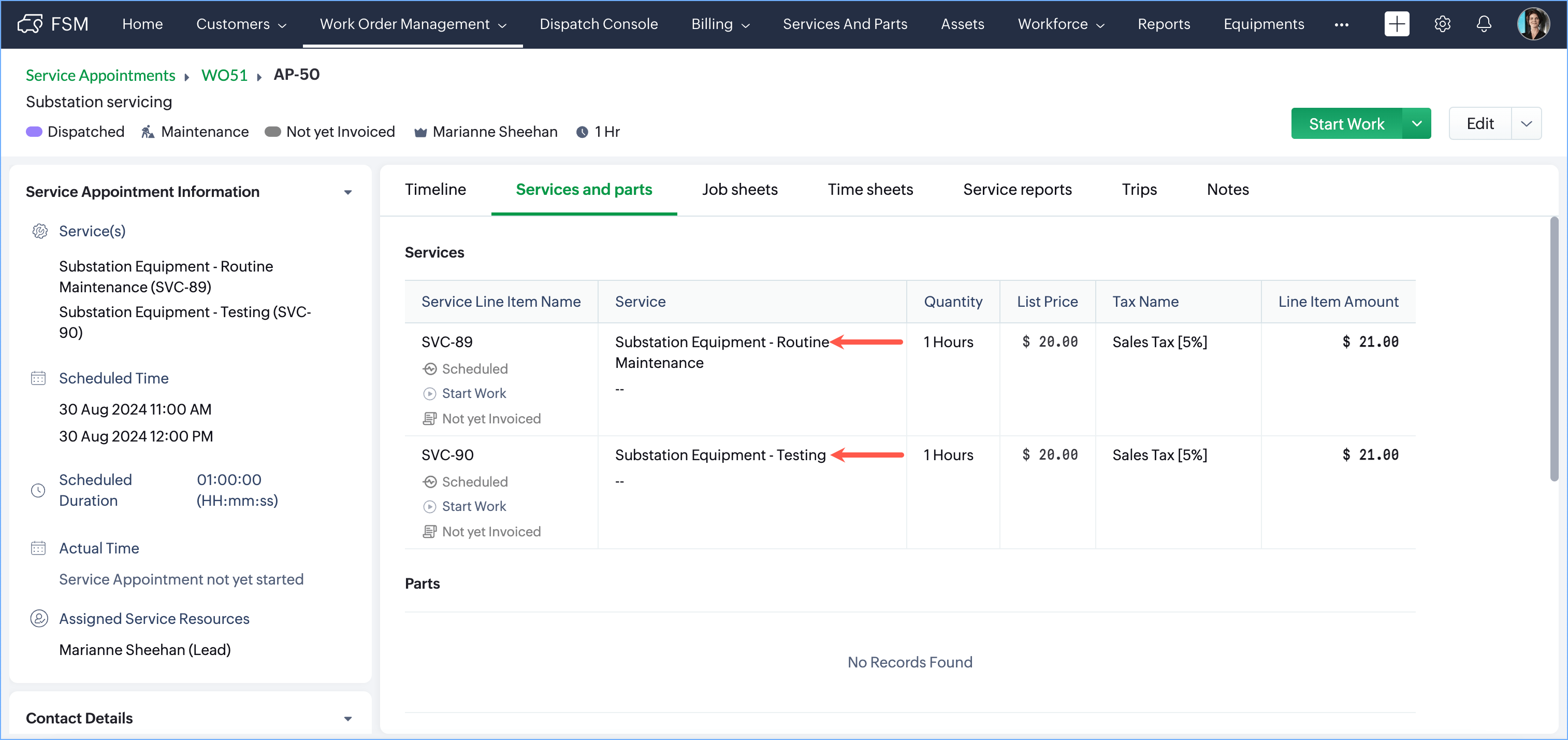 All the job sheets associated with the services added to a service appointment will be listed as job sheet line items under the Job sheets tab. Starting from the first service in the service appointment, all the job sheets associated with each service will be added until the limit of 20 is reached. Consider this example for better understanding.
