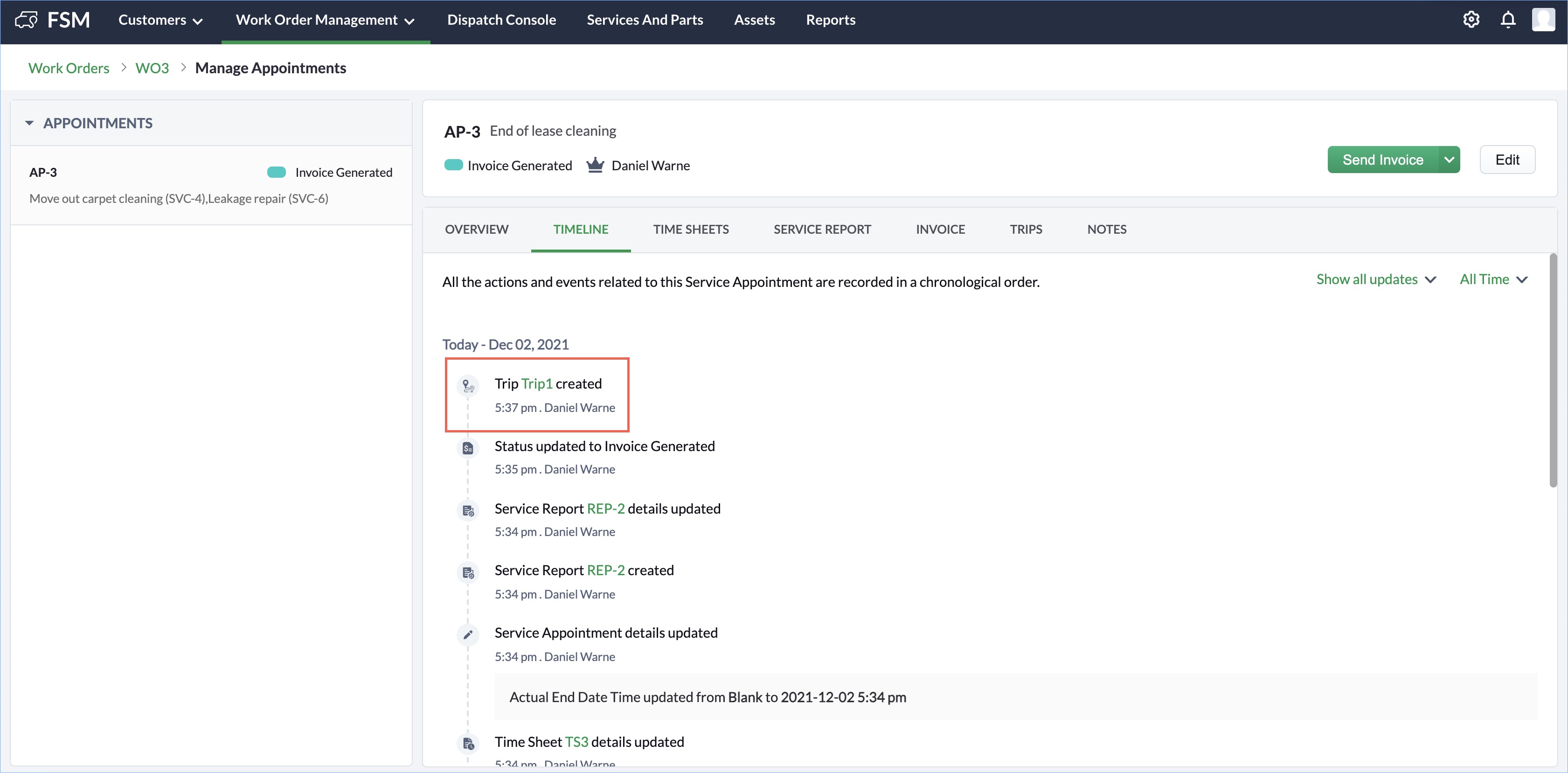 - Trip: When a trip is initiated for a service appointment or when the trip details are updated. Click on the name of the trip to view the details of the trip.