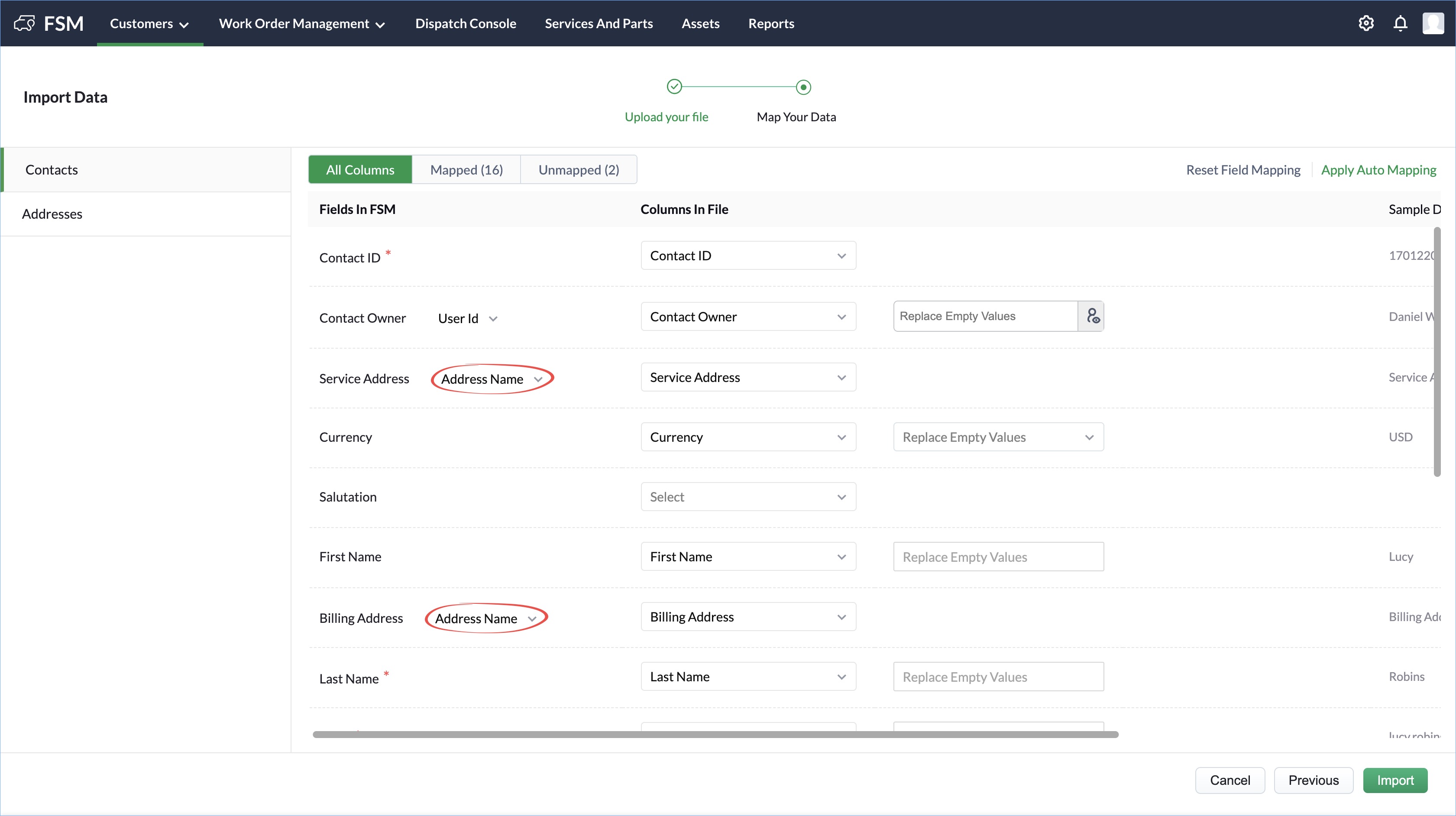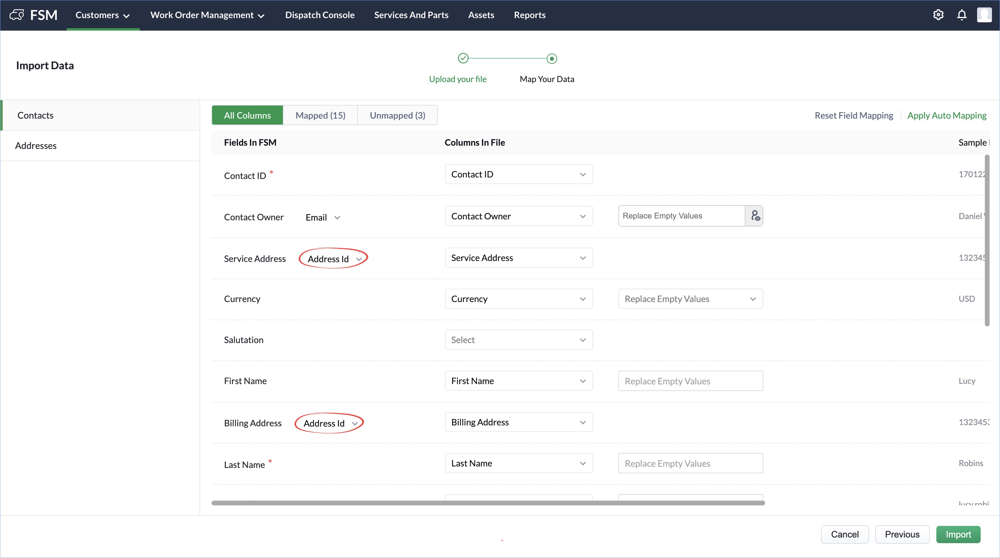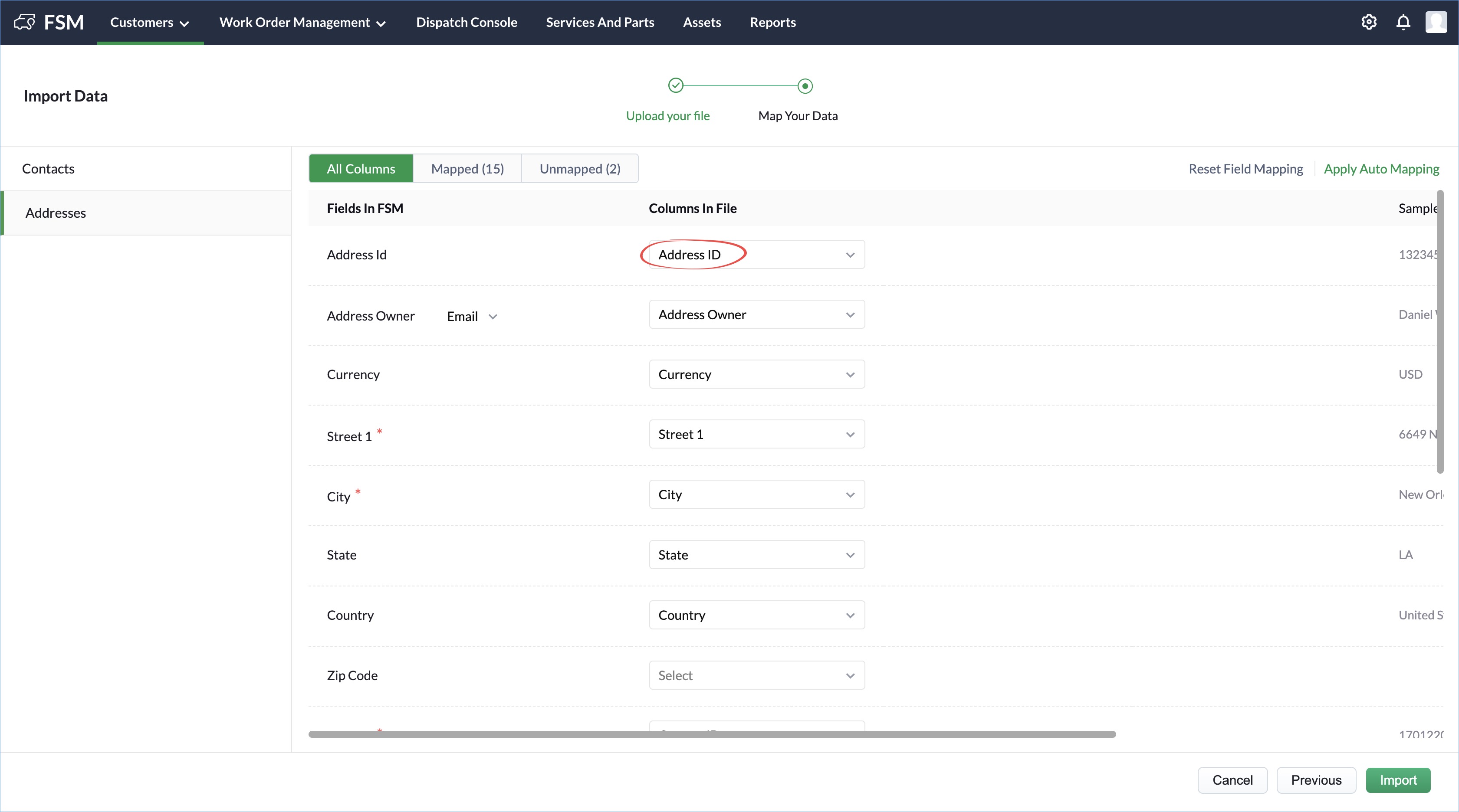 - The Address ID field from the Address CSV file is mapped to the Address Id field of FSM.