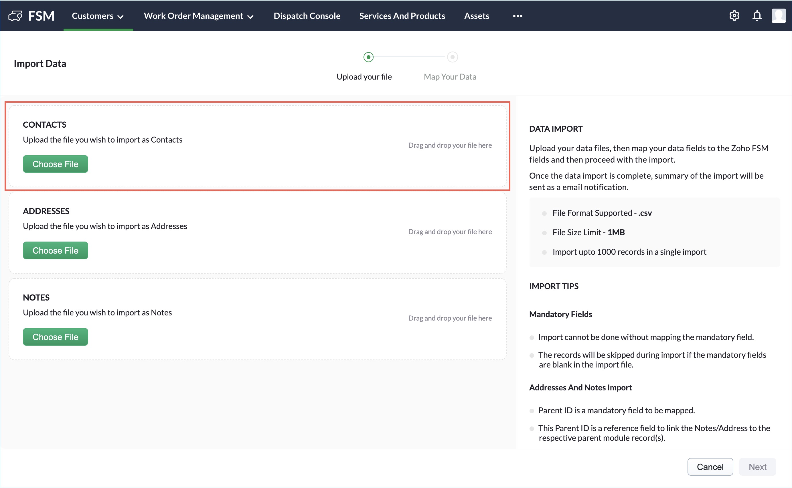 Data from external sources can be added to Zoho FSM. You can easily populate data in the modules in bulk. External data can be imported to Zoho FSM in three simple steps: