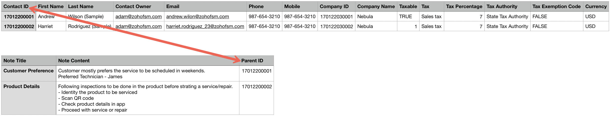 Note: Please be aware that the record IDs used in the CSV files are temporary placeholders, and new IDs will be automatically generated once the records are created in Zoho FSM.