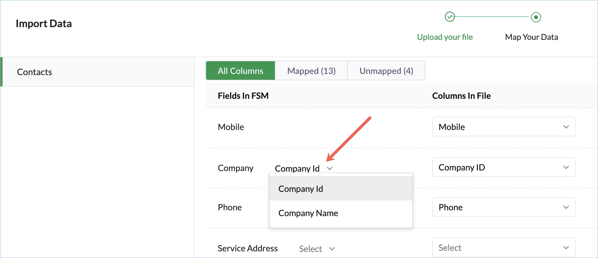 - Map fields in Zoho FSM to columns in your data file