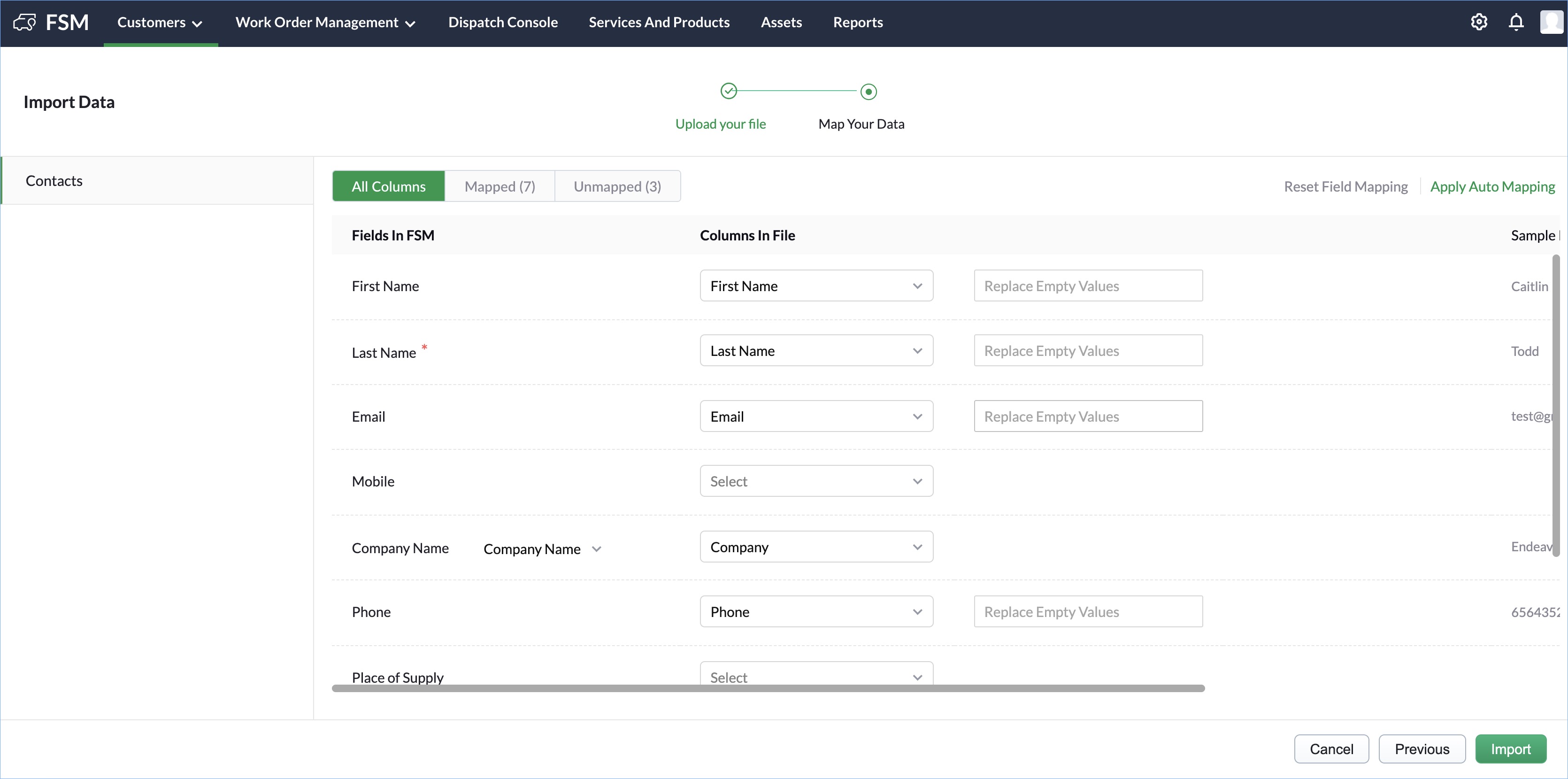 - From the Fields in FSM dropdown, select the [Module] fields to map the corresponding value to under Columns in File. Click Import to proceed.