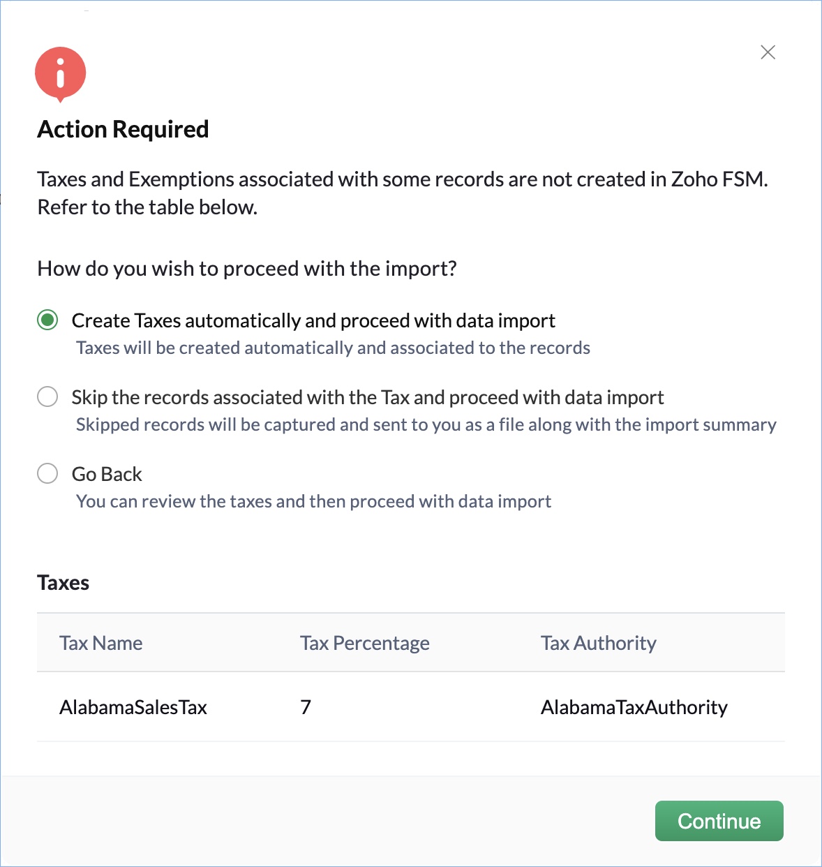 If you are adding new tax information, then the following popup will be displayed. Choose the desired option and click Continue.