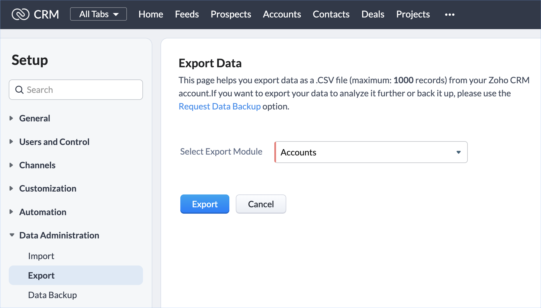 - Navigate to Setup > Data Administration > Export.