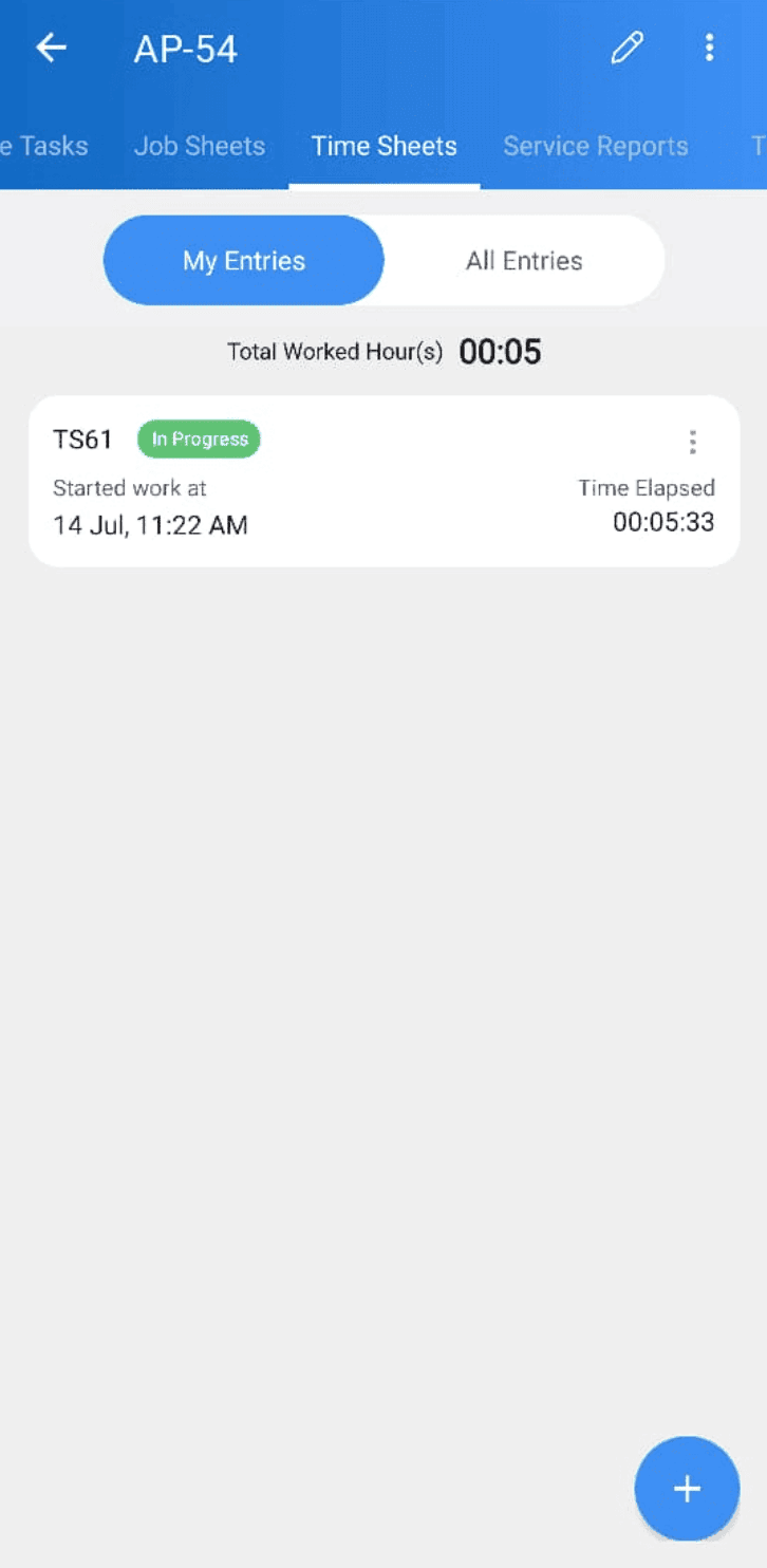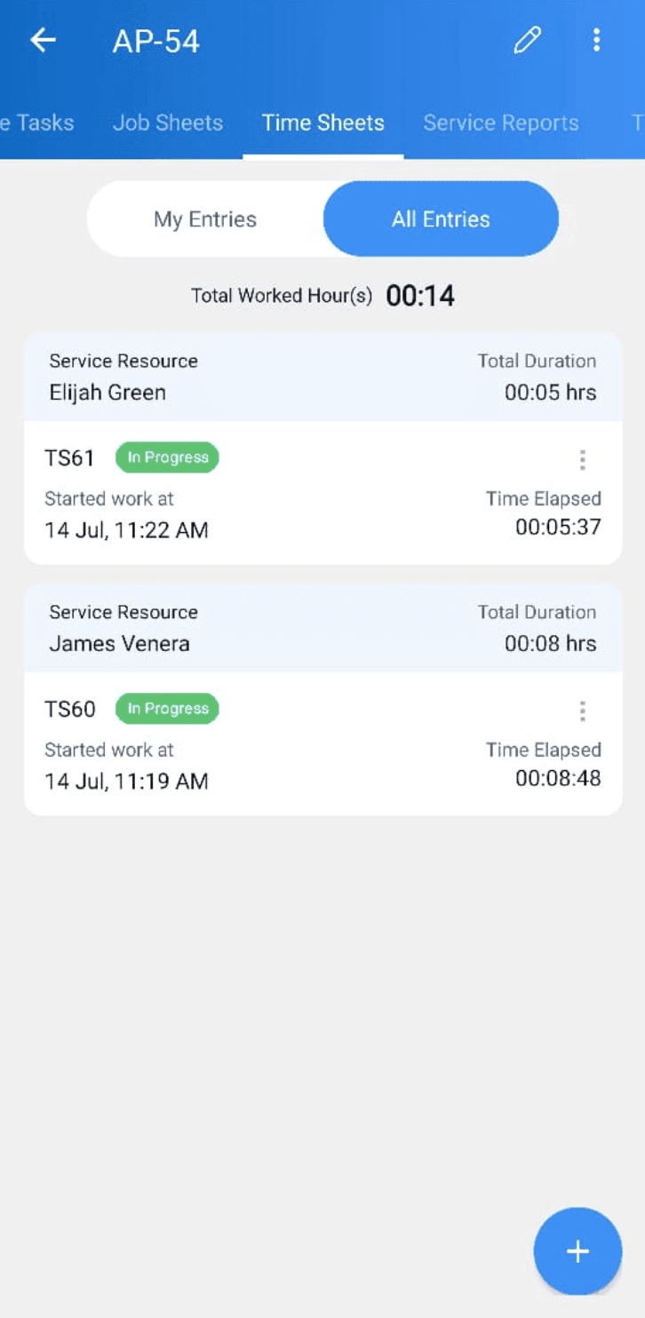 When a field agent taps Start Work(for Service line item or Service Task), an individual Timesheet entry is created. Timesheets the user started appear under My Entries. Timesheets started by other Crew members appear under All Entries. Even if Crew ...