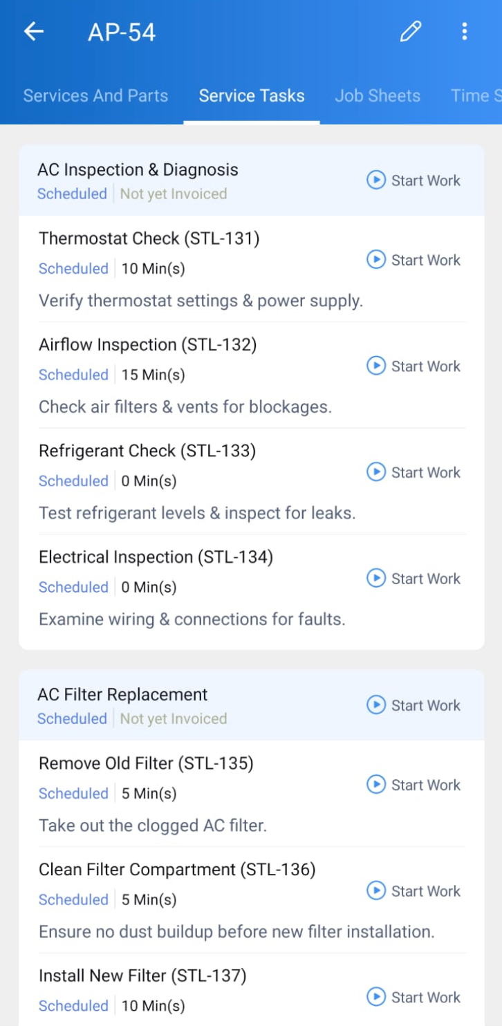 3. When a field agent taps Start Work(for Service line item or Service Task), an individual Timesheet entry is created.