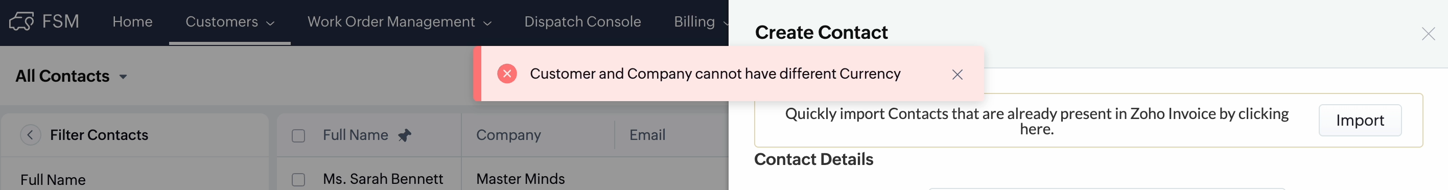 1. If the currency you select while creating the Contact doesn't match the Company's currency, the system throws this error: "Customer and Company cannot have different Currency."