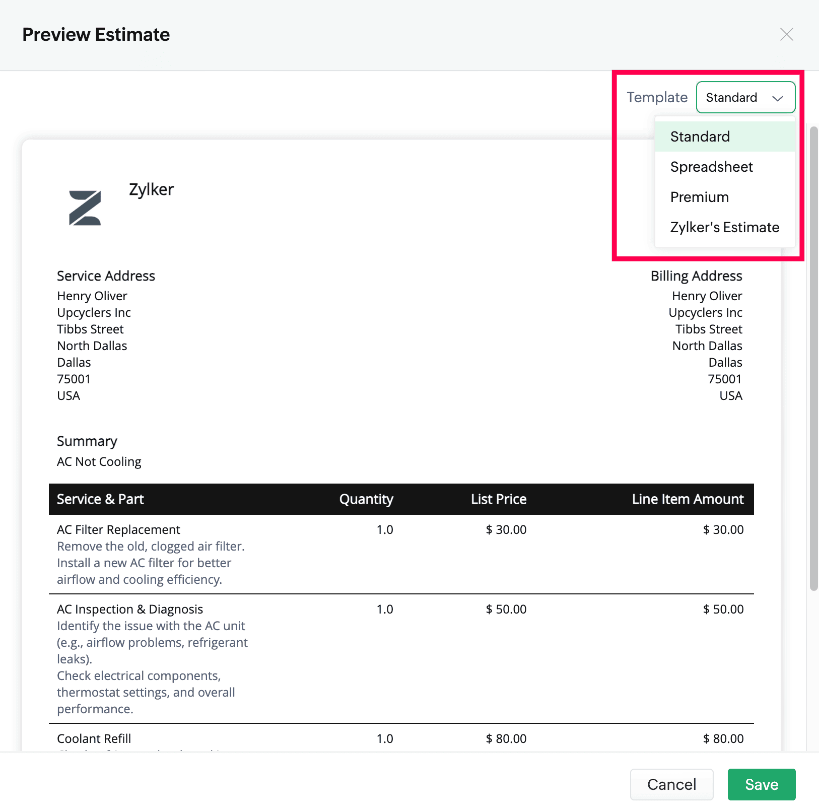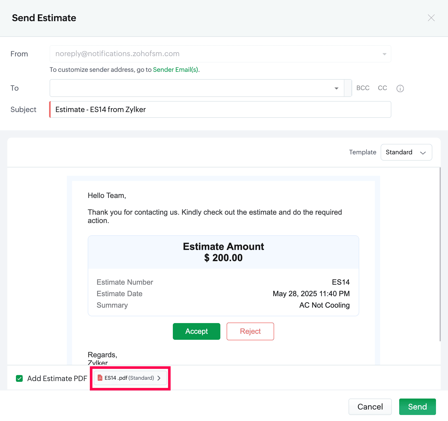 Can I change the Estimate PDF template while sending an Estimate in Zoho FSM? How do I change the Estimate PDF template while sending an Estimate in Zoho FSM?