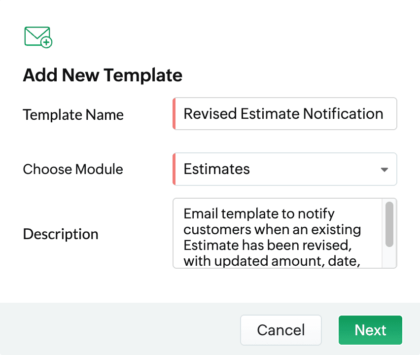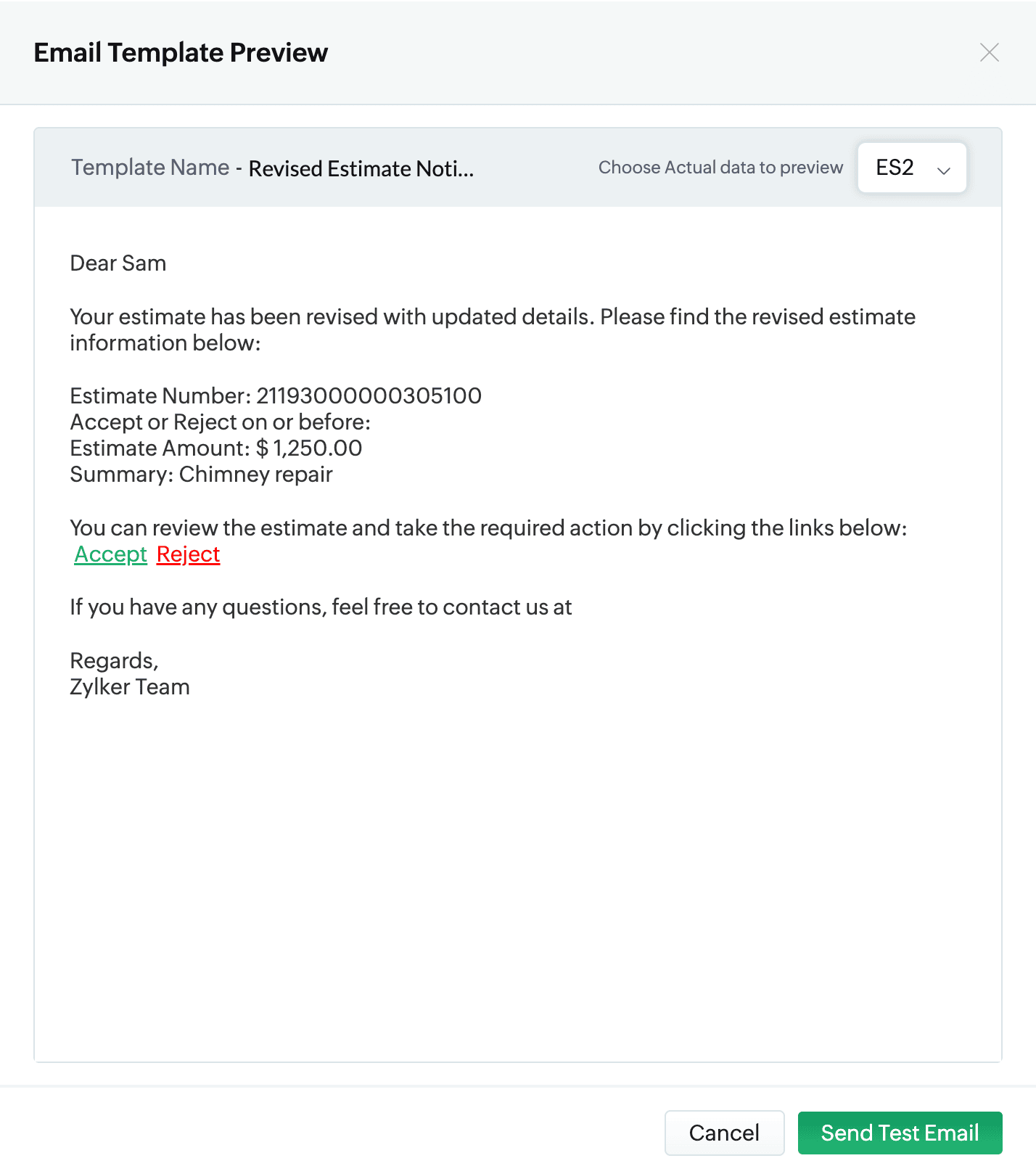 An Email Estimate Template in Zoho FSM is the email format used when sending an Estimate to a customer. By default, Zoho FSM provides a standard email template. However, you can also create your own Email template. Refer How to create a custom ...
