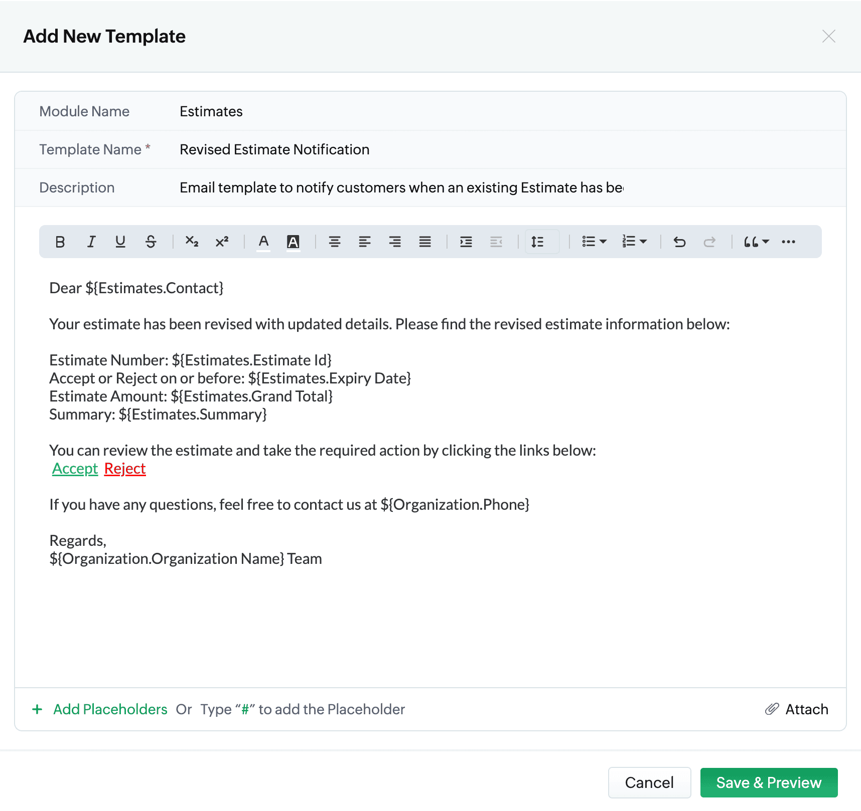 2. Use placeholders by typing # to insert dynamic fields (like Estimate Number, Amount, Customer Name, etc.).