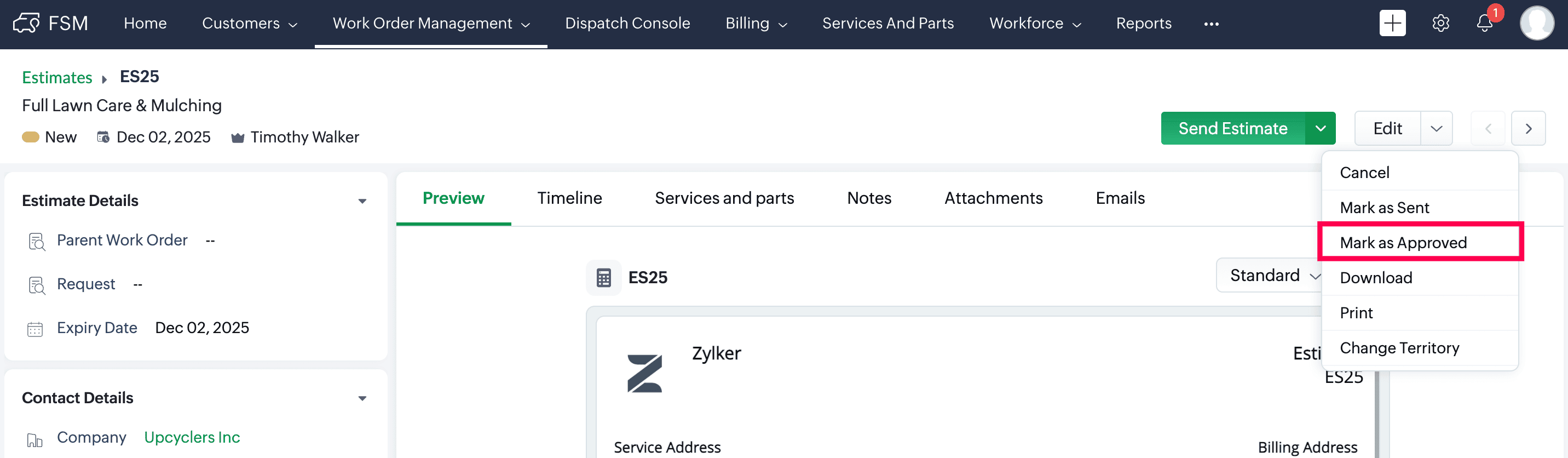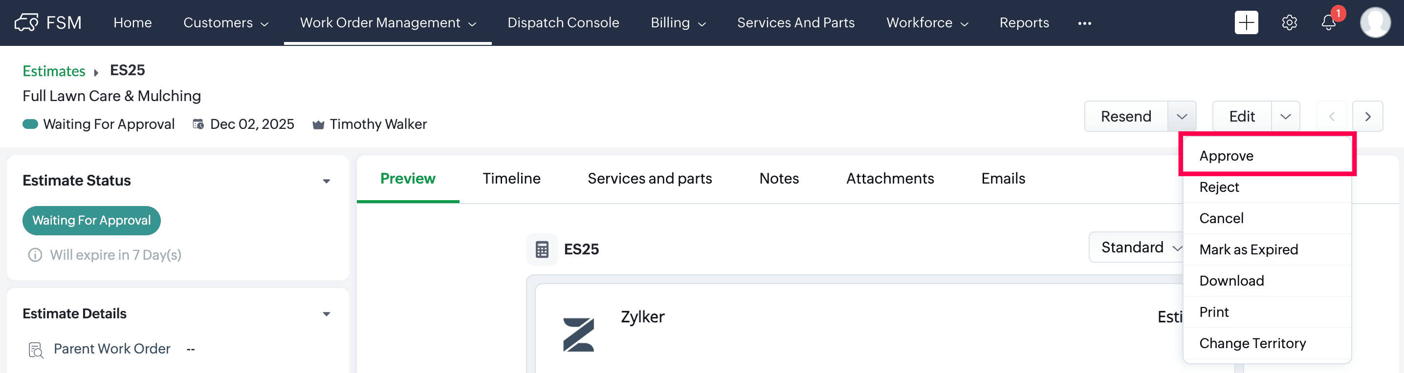 Approving an Estimate manually in Zoho FSM