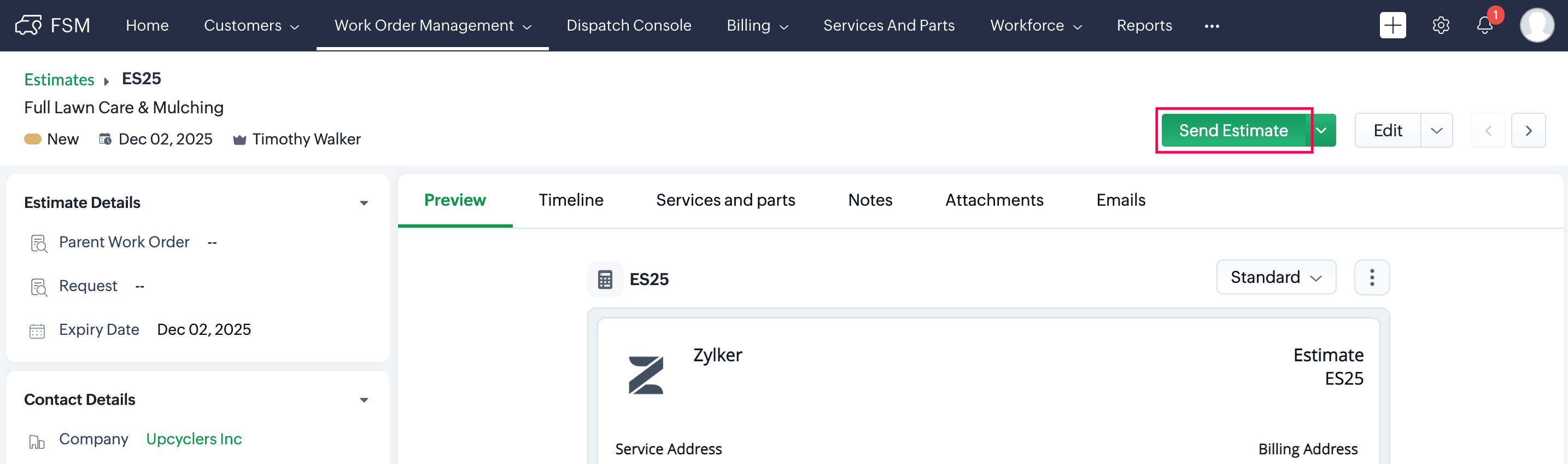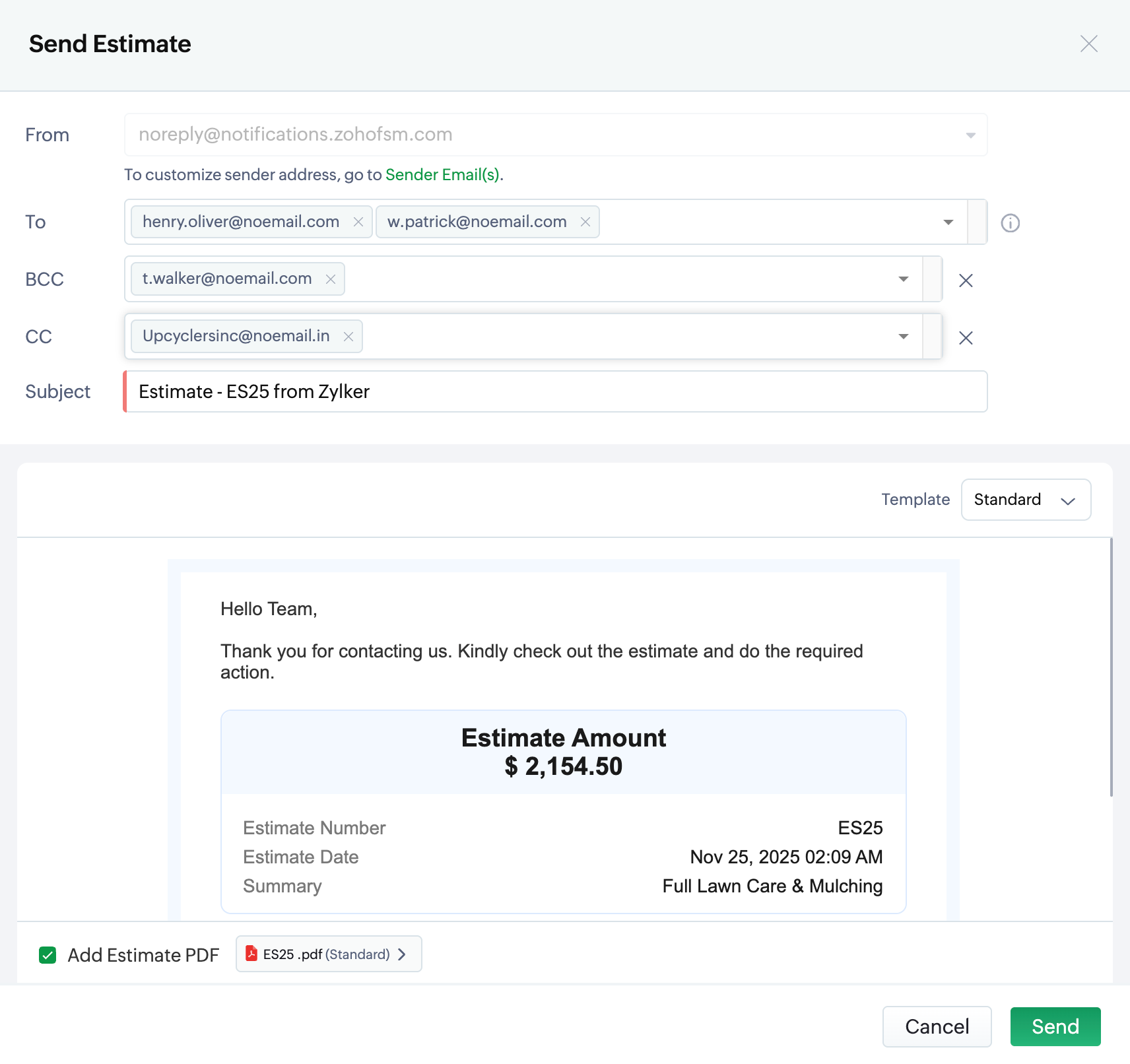 1. If the estimate is created for a standalone contact (no company selected while creating the estimate), the dropdown will include only the contact’s email address.