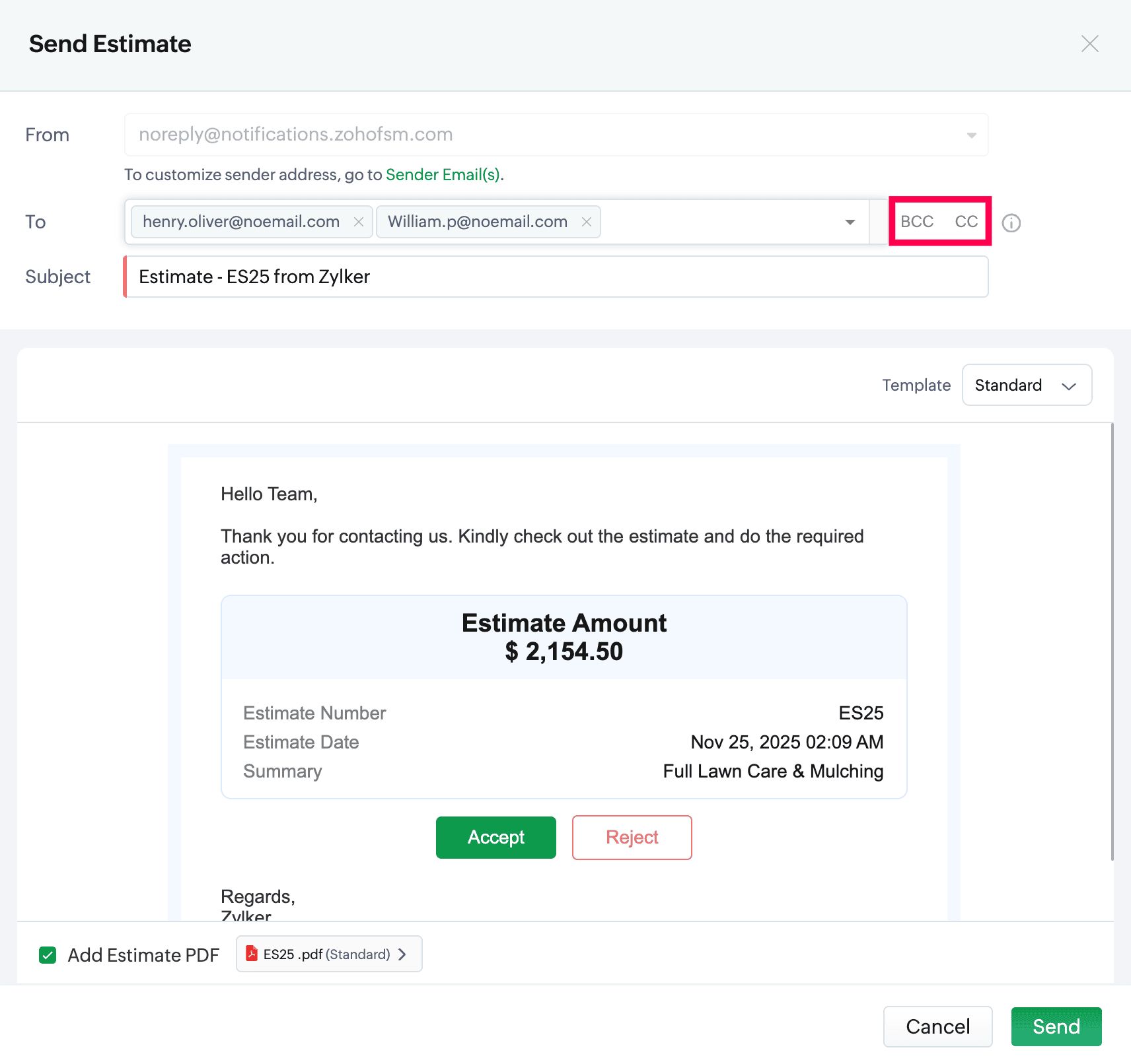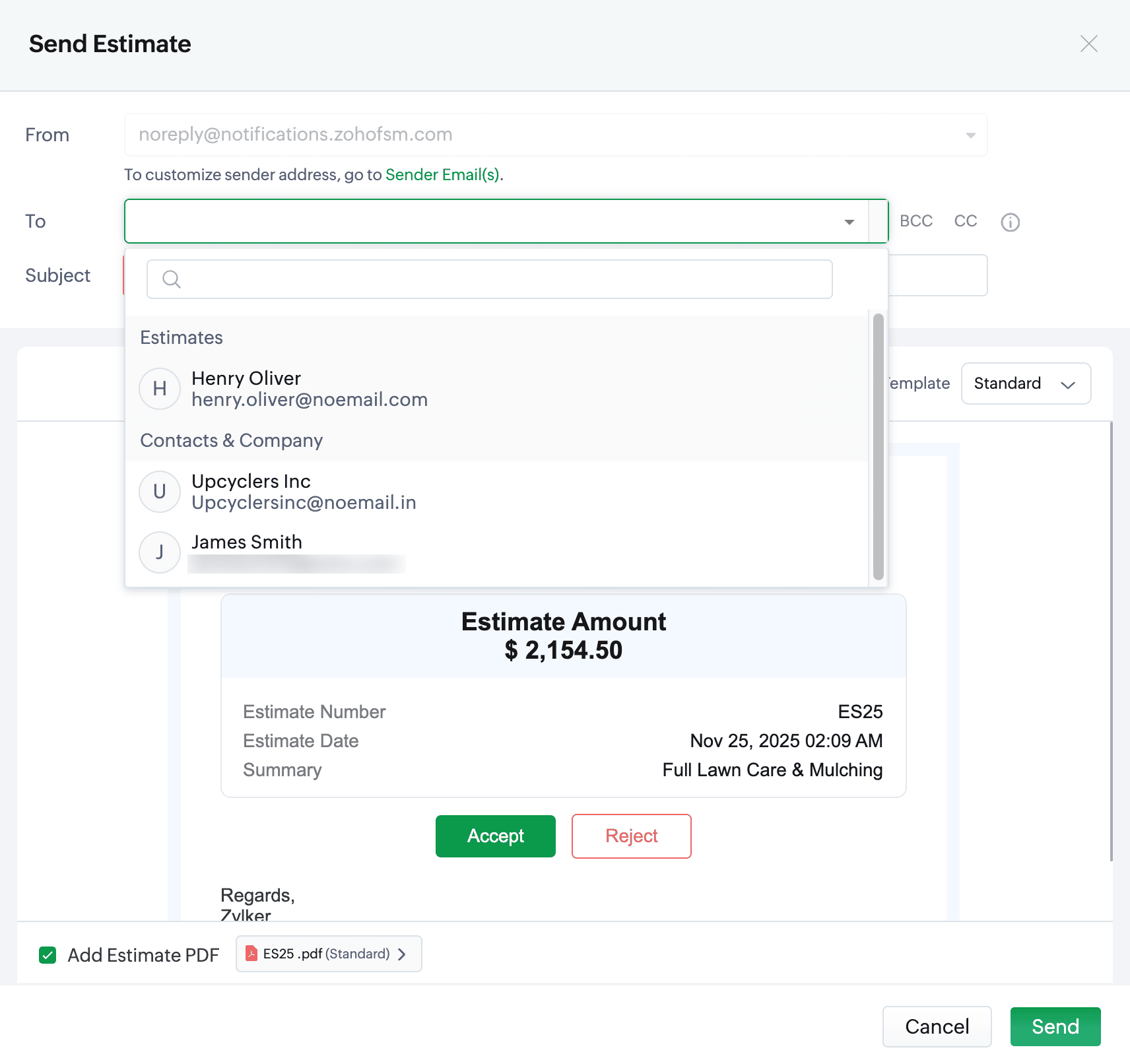 3. In the Send Estimate window, enter the recipient’s email address in the To field, select from the dropdown or type an additional email address and press Enter to add one.