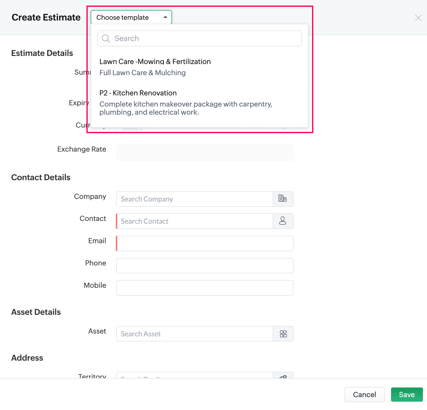 • Can I create a template for estimate creation in Zoho FSM? How do I create a template with bundled services to use while creating Estimates in Zoho FSM?