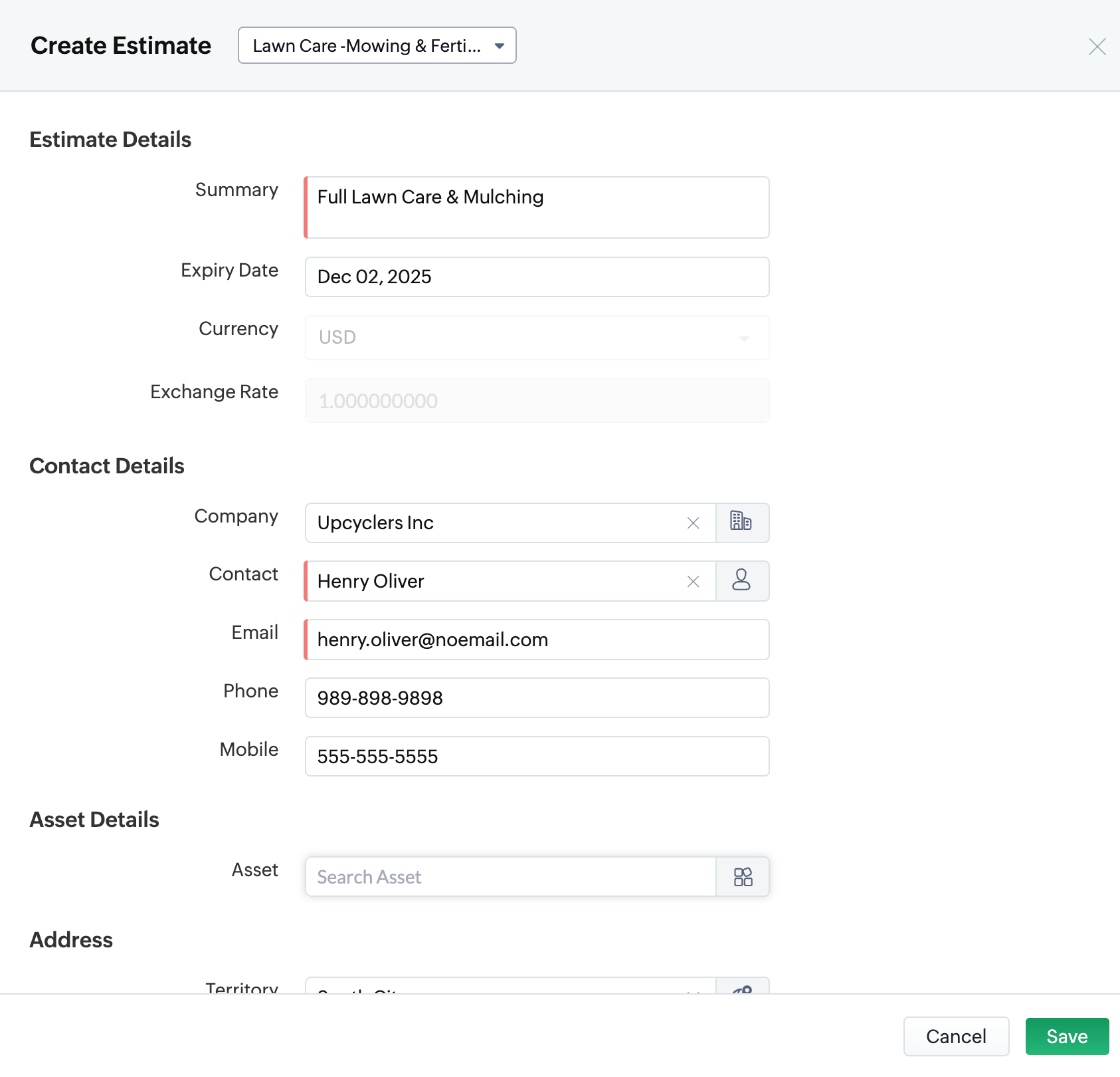 Creating a new estimate in Zoho FSM Go to Work Order Management > Estimates. Click create. (or) Click the (+) icon in the top-right corner and select Estimate. Enter the required details: Summary Expiry Date (validity period of the estimate) Currency ...
