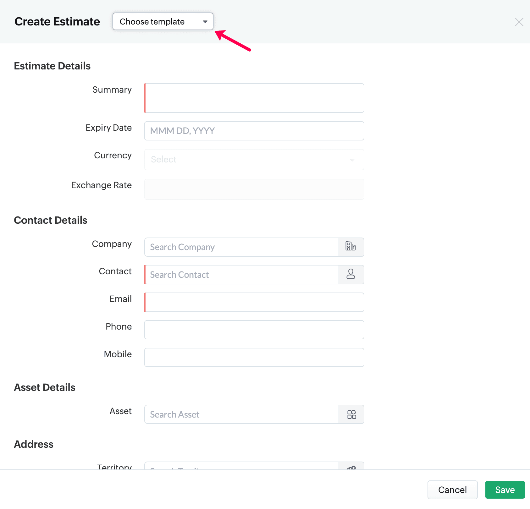 2. In the create estimate page, open the choose template drop-down.