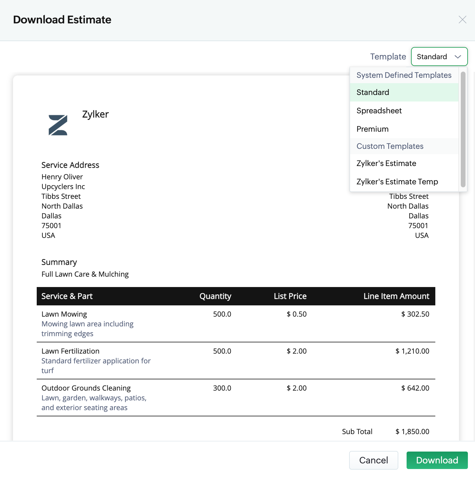 3. In the Download Estimate window, choose the desired Estimate PDF template.