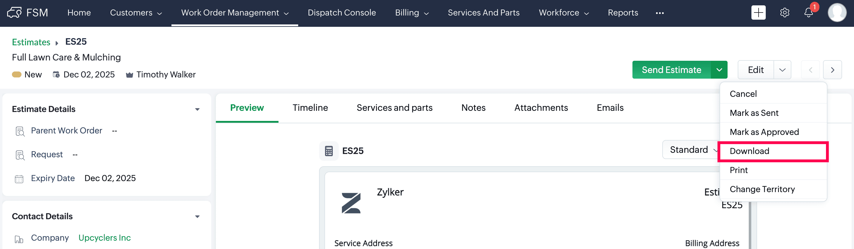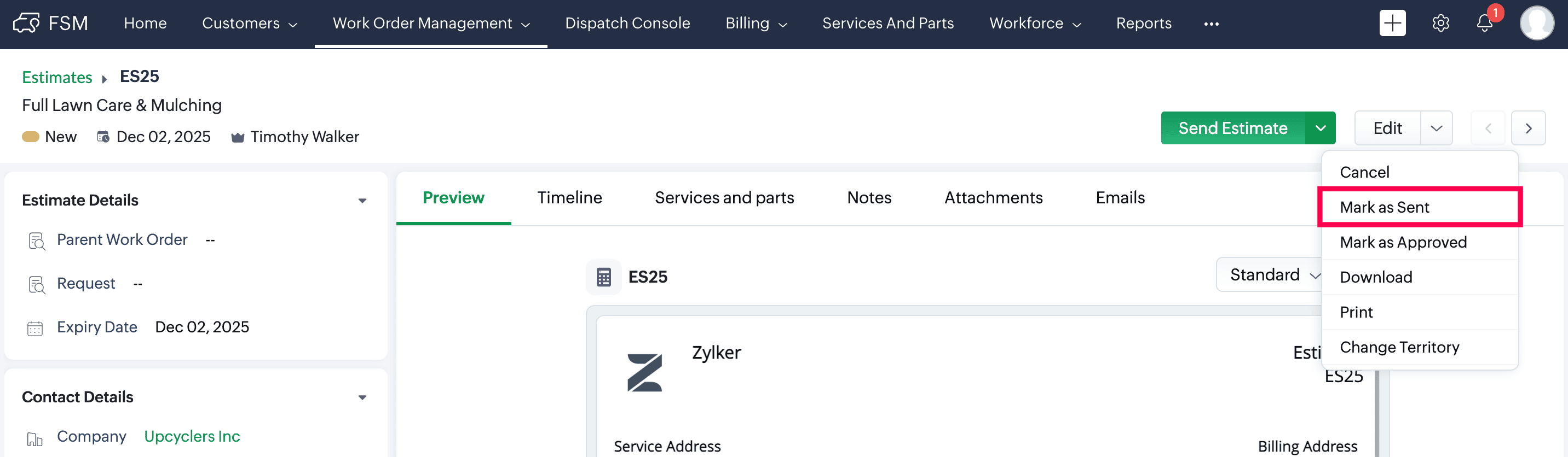 After sending it externally, you can mark the estimate as sent within Zoho FSM.