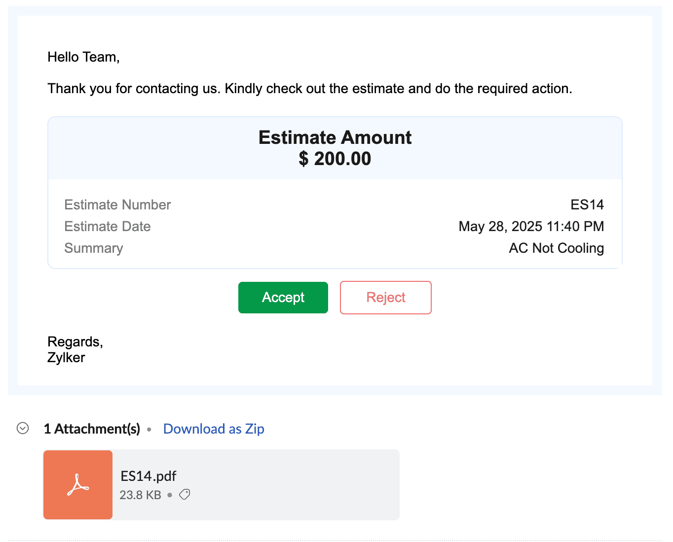 An Email Estimate Template in Zoho FSM is the email format used when sending an Estimate to a customer.