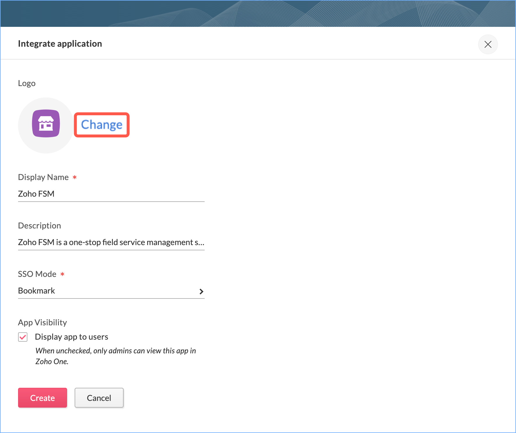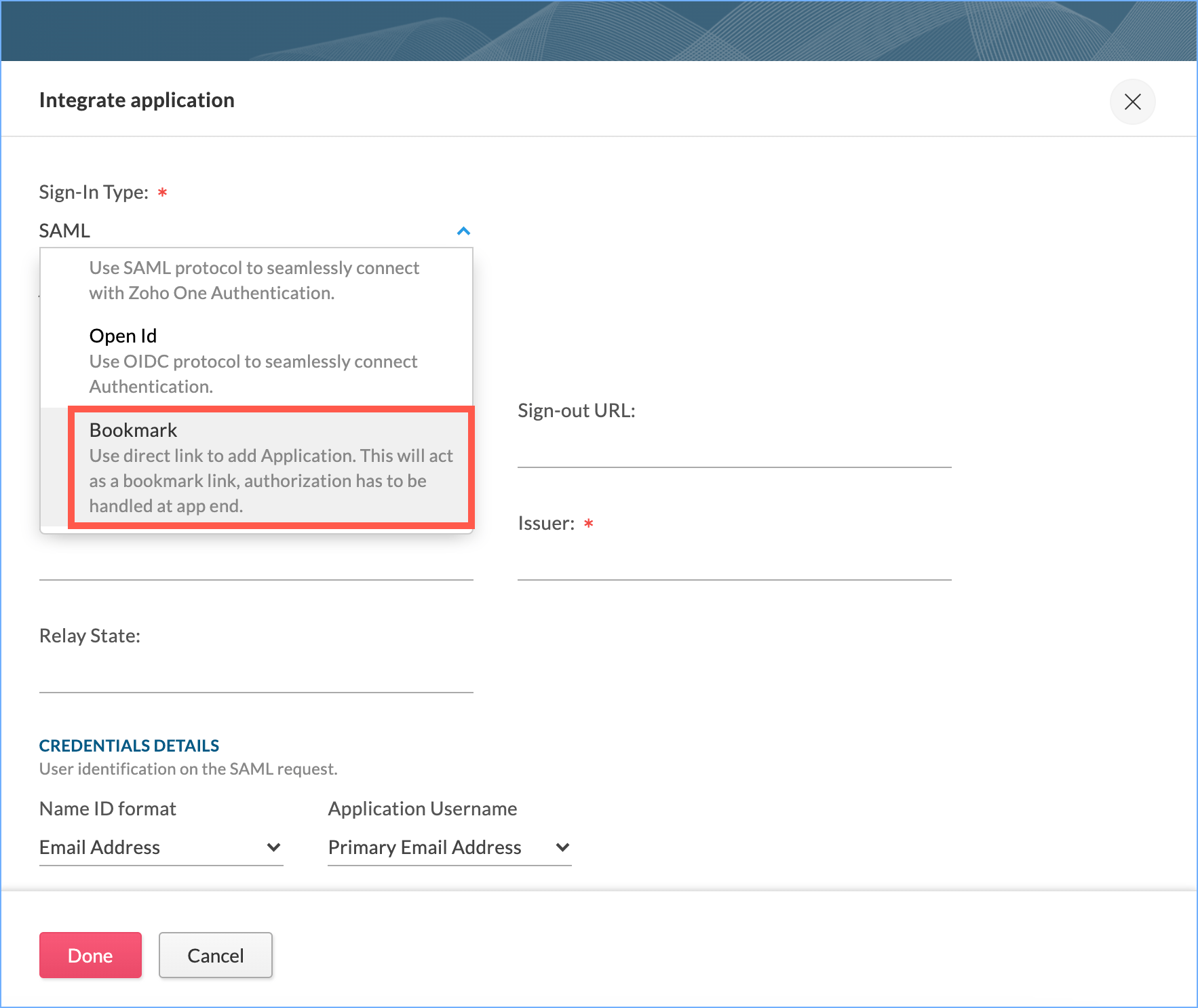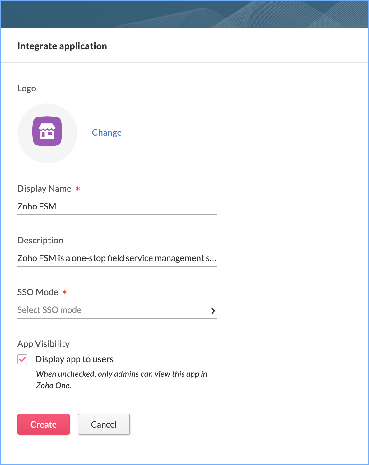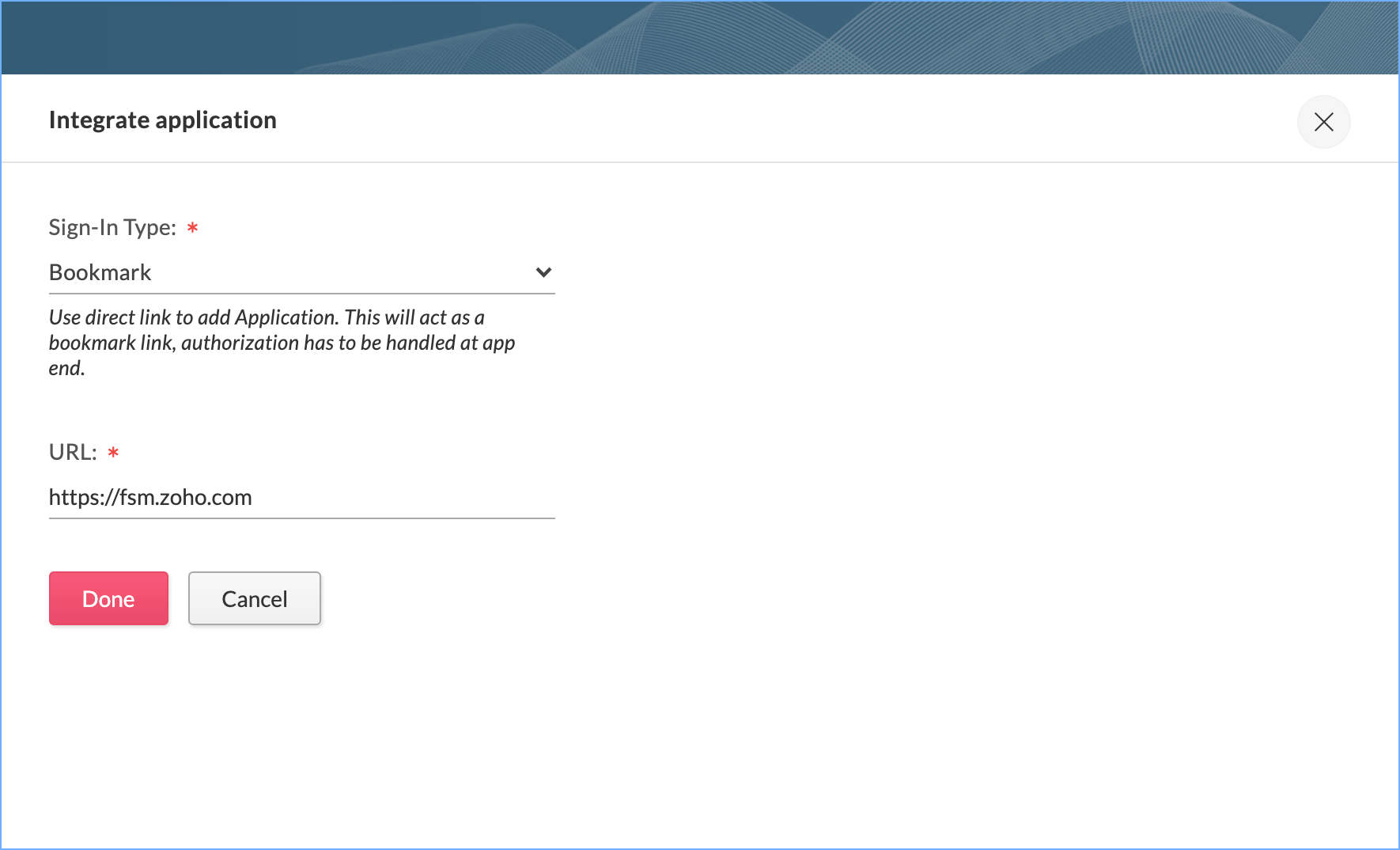 6. Enter the application URL (https://fsm.zoho.com) for Zoho FSM and click Done.