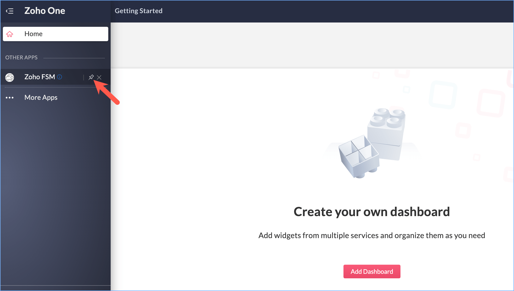 Hover over the Zoho One logo to see the left menu. Zoho FSM will be listed there. Hover over it and click on Pin App to easily access Zoho FSM.