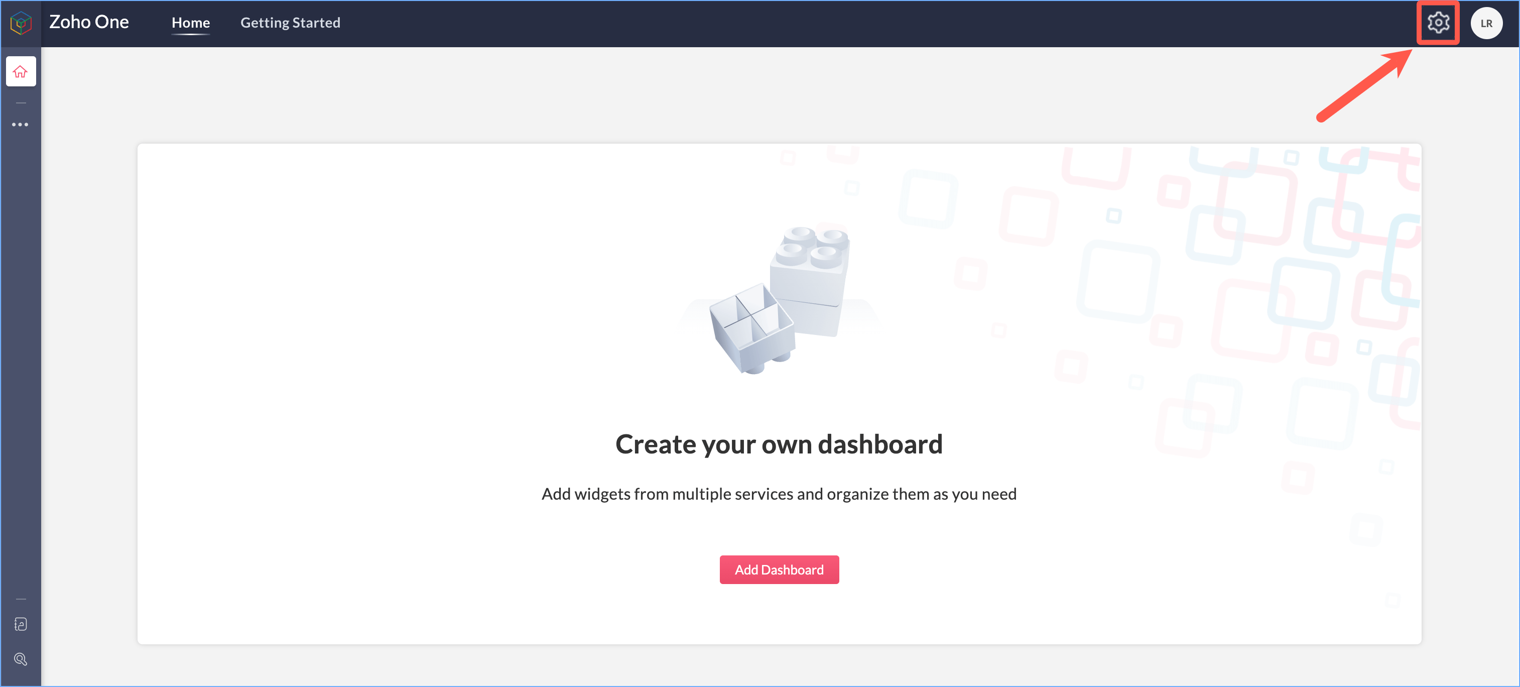 1. Log in to your Zoho One account and click the Configure settings icon at the top right corner.