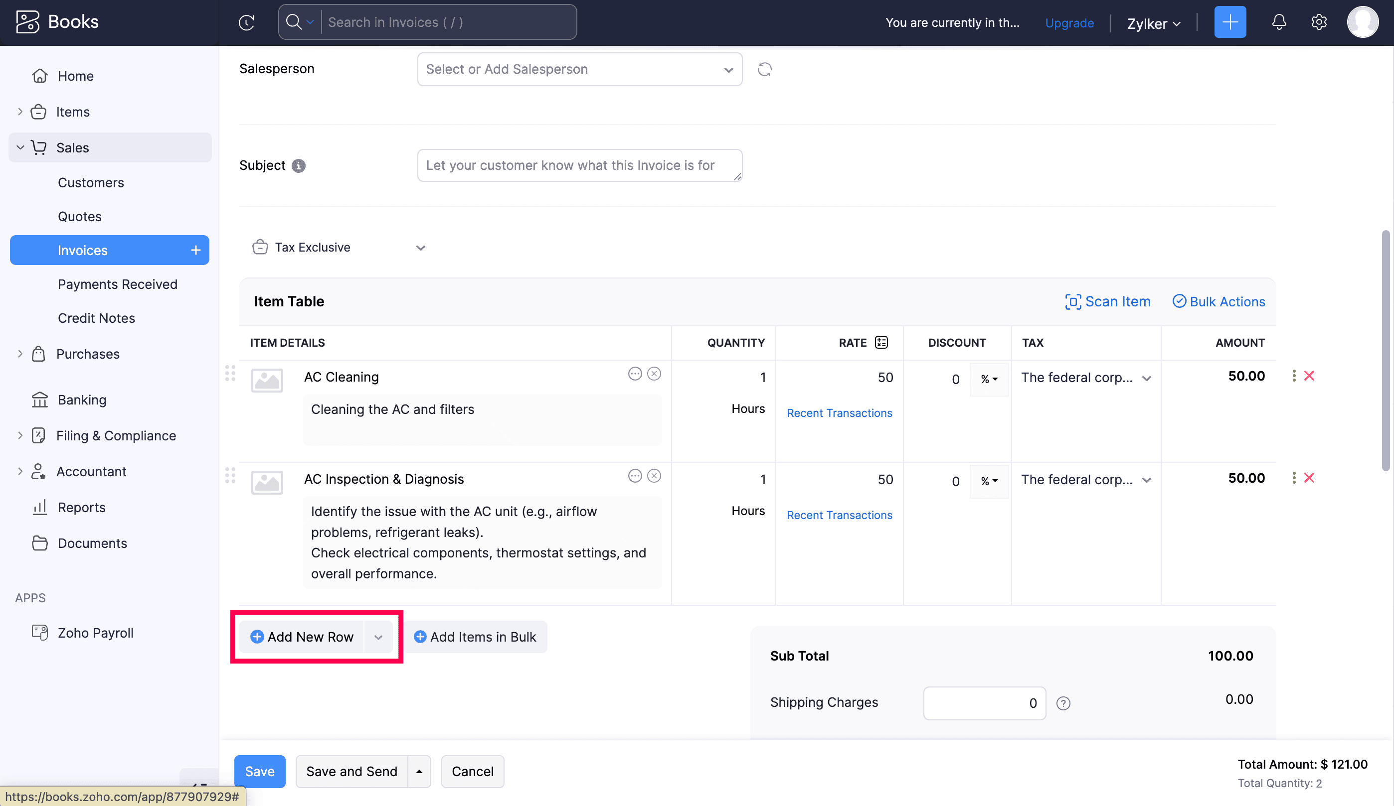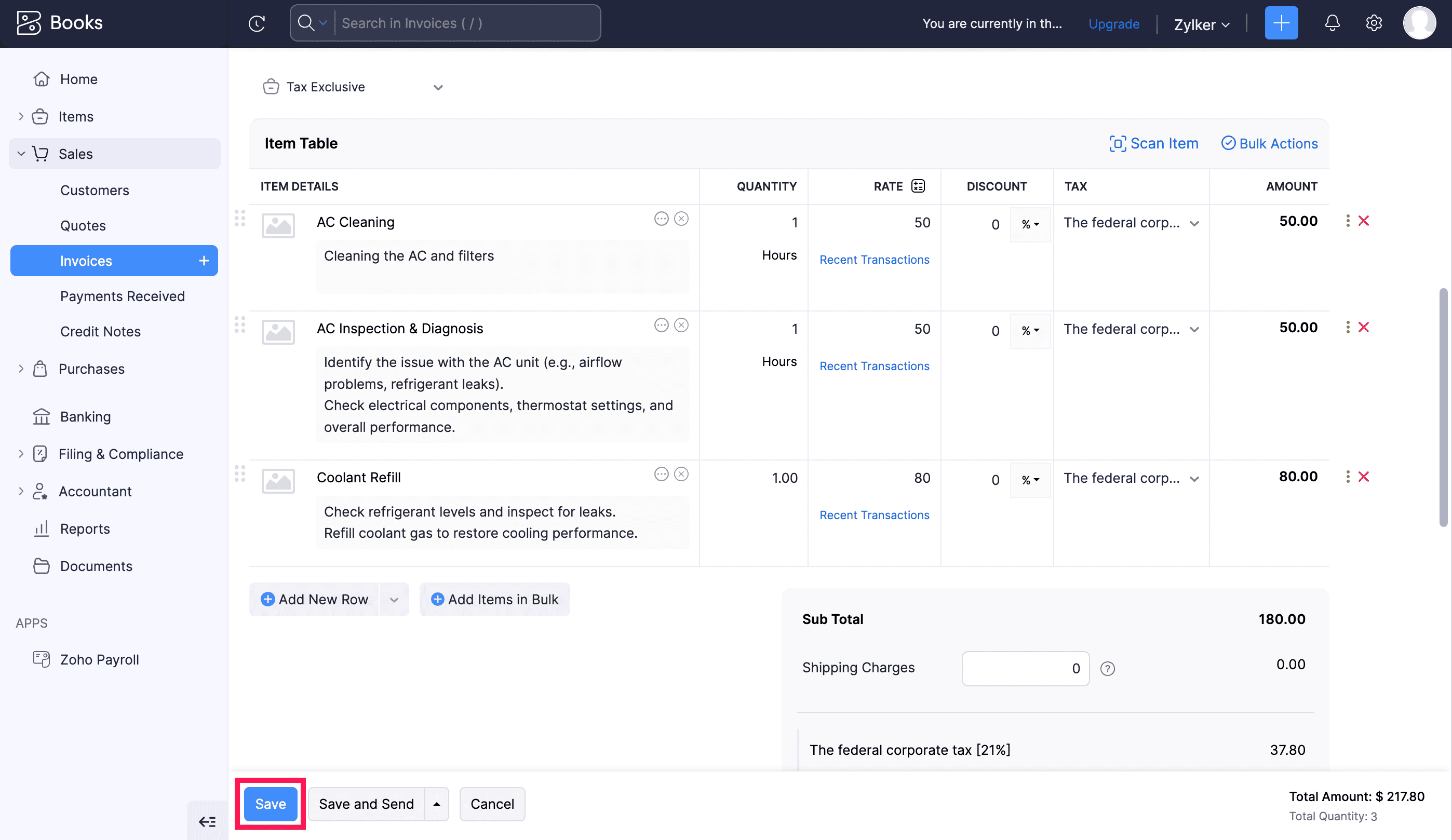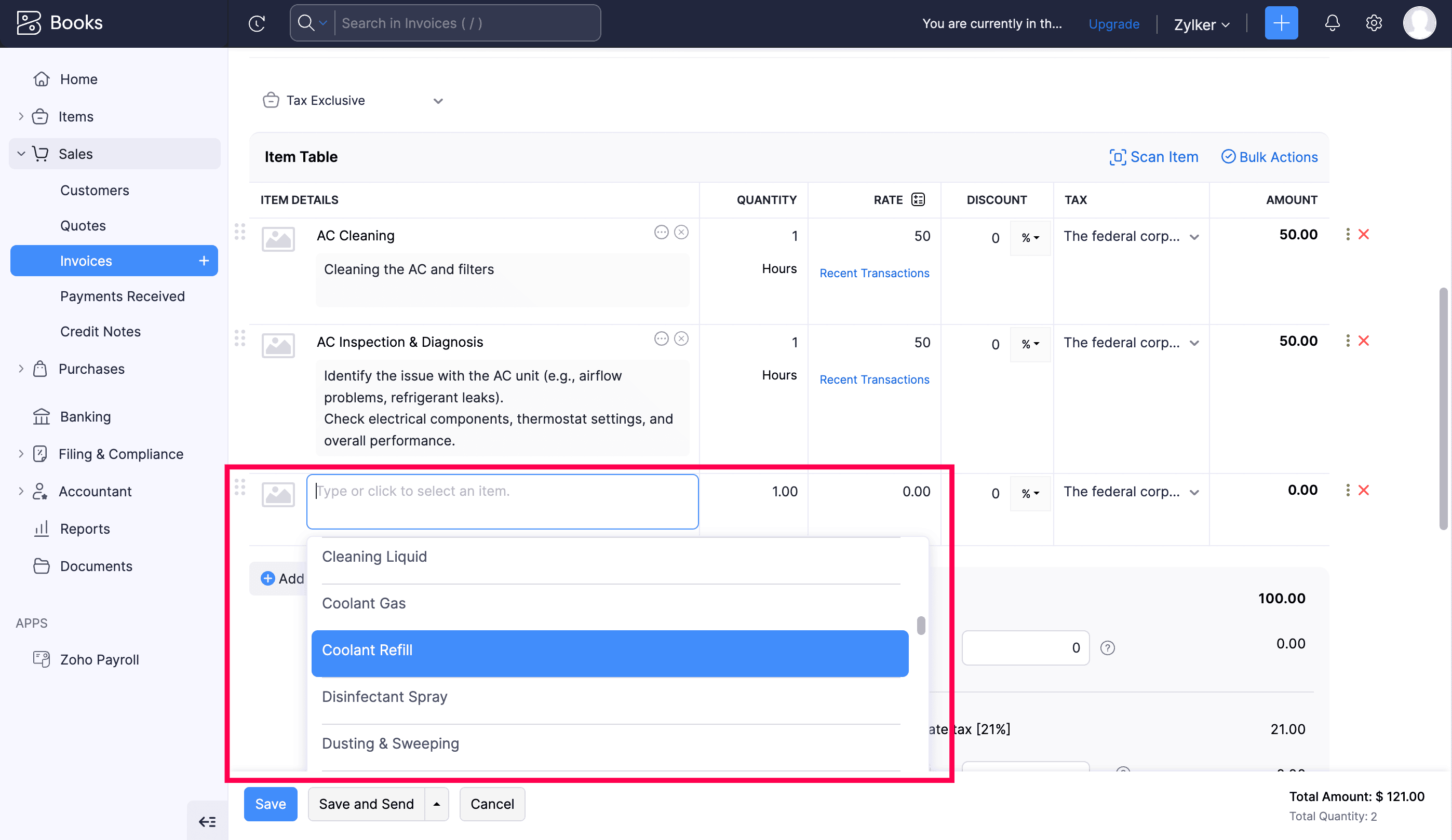 Adding Additional Service or Part Line Items from Zoho Books/Invoice