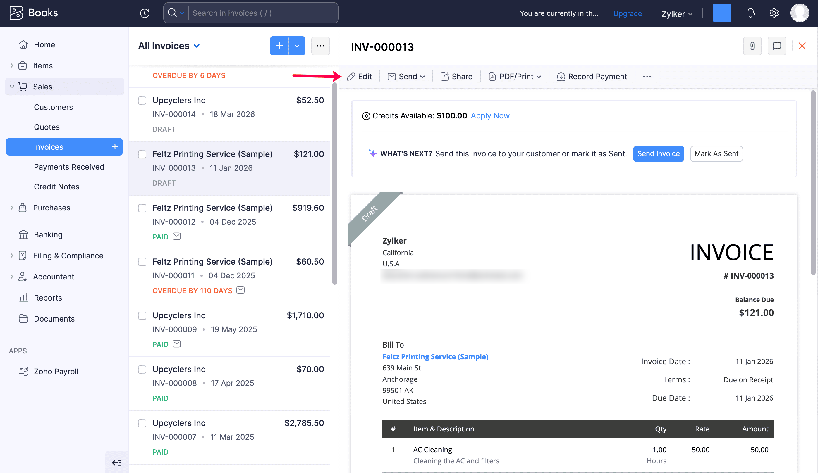 - Click Open in Zoho Invoice.