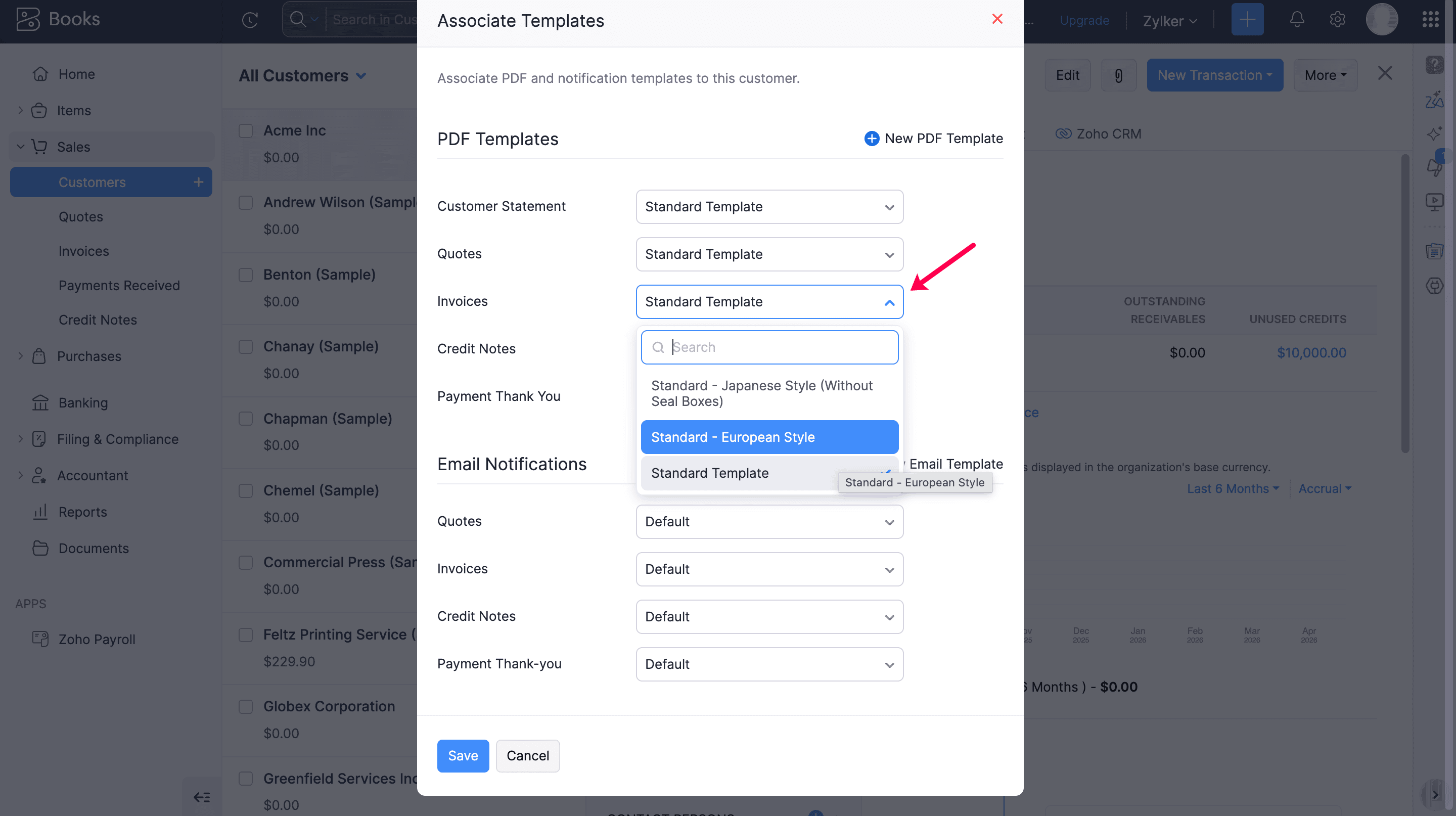 - Under the Invoice section, choose the desired template from the dropdown.
