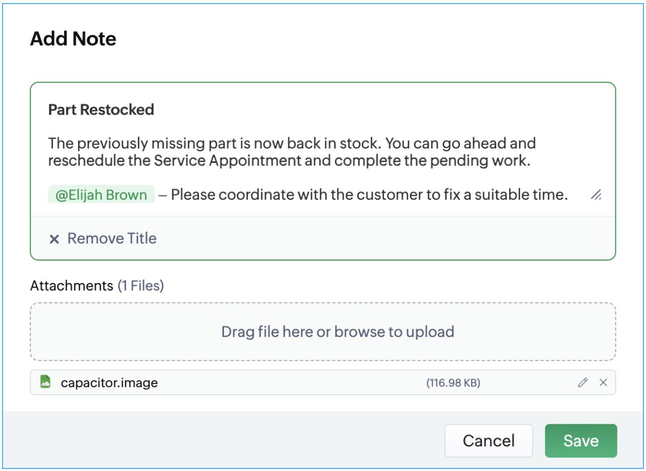 NotesA maximum of 20 attachments can be added per note, and the total size must not exceed 150 MB. You can also add notes from the Zoho FSM mobile app. Notes added to Work Orders and Service Appointments are visible in the Dispatch Console as well.