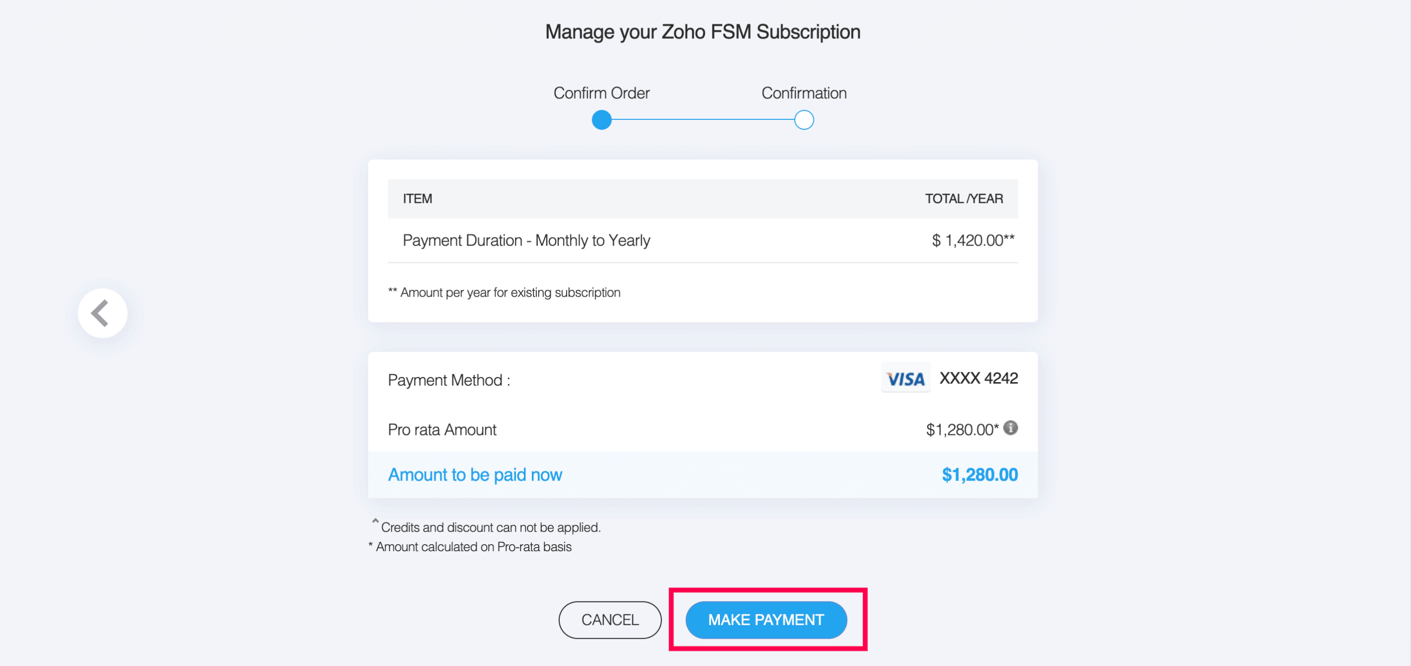 To switch from a monthly to an annual subscription in Zoho FSM: