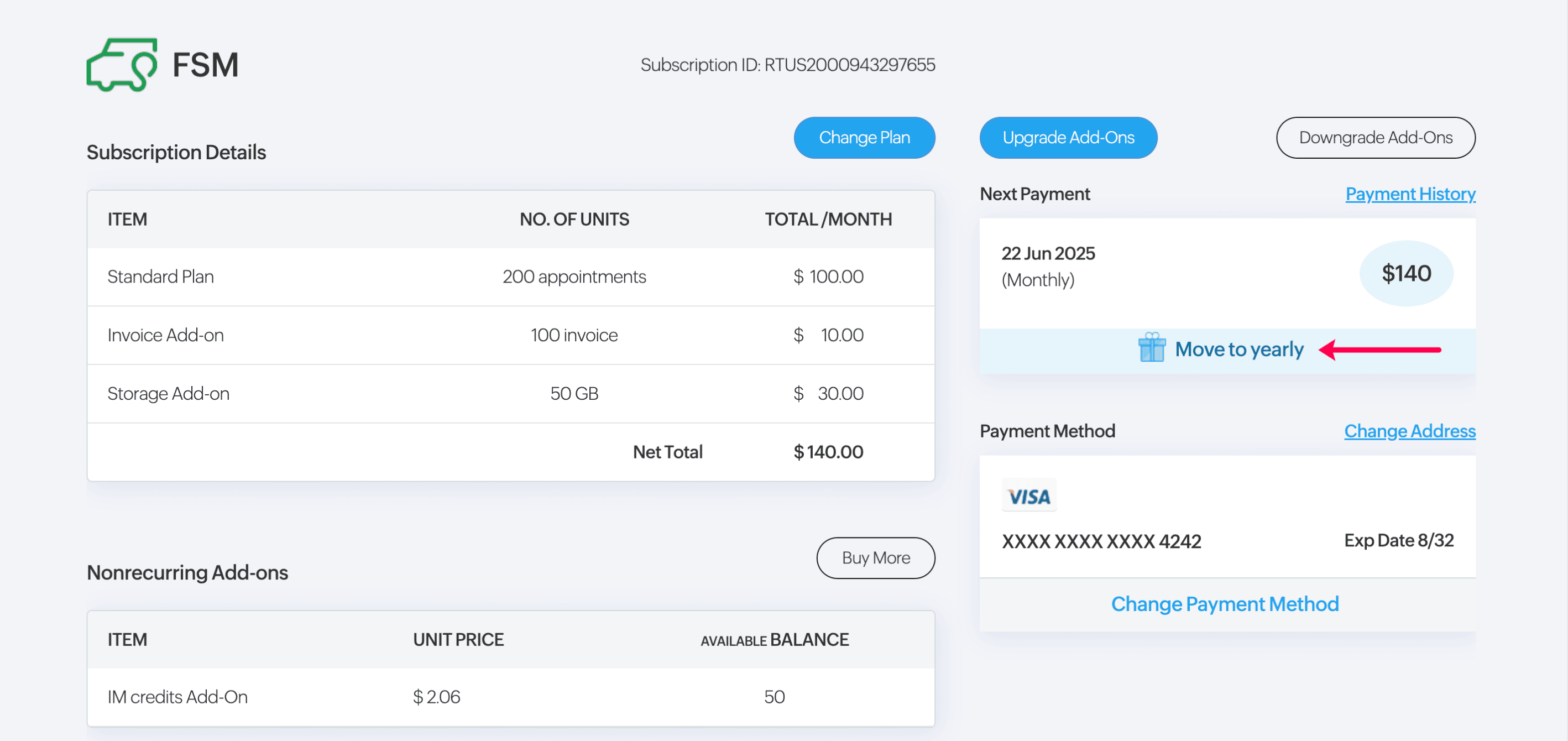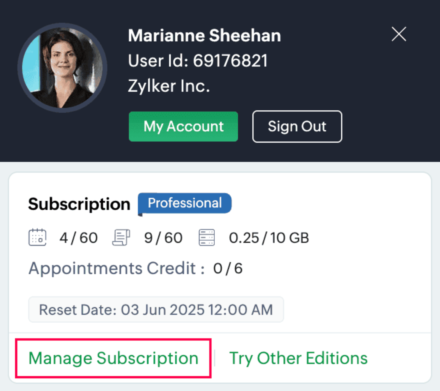 To purchase a subscription in Zoho FSM: Log in to Zoho FSM. Click on the Profile at the top-right corner and select Manage Subscription. Choose the number of additional appointments you want to purchase. You can also select the subscription frequency ...