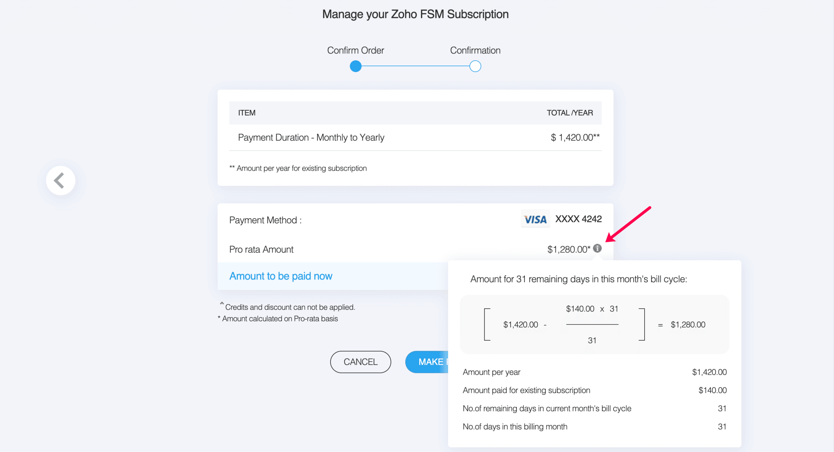 5. You can view the prorated amount to be paid for the annual subscription by clicking the information icon [   ].