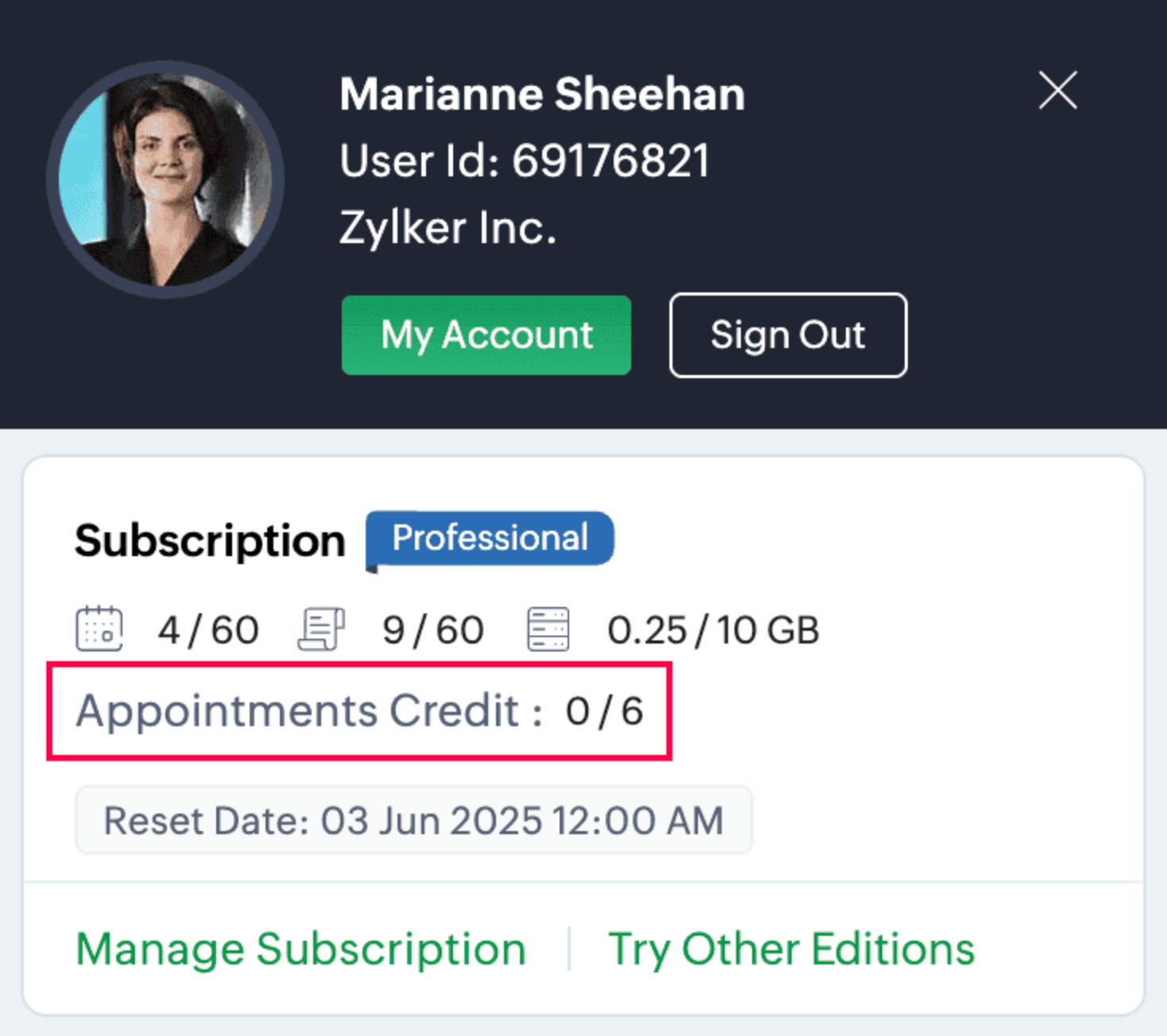 You can view your appointment credits by clicking the profile icon at the top-right corner.