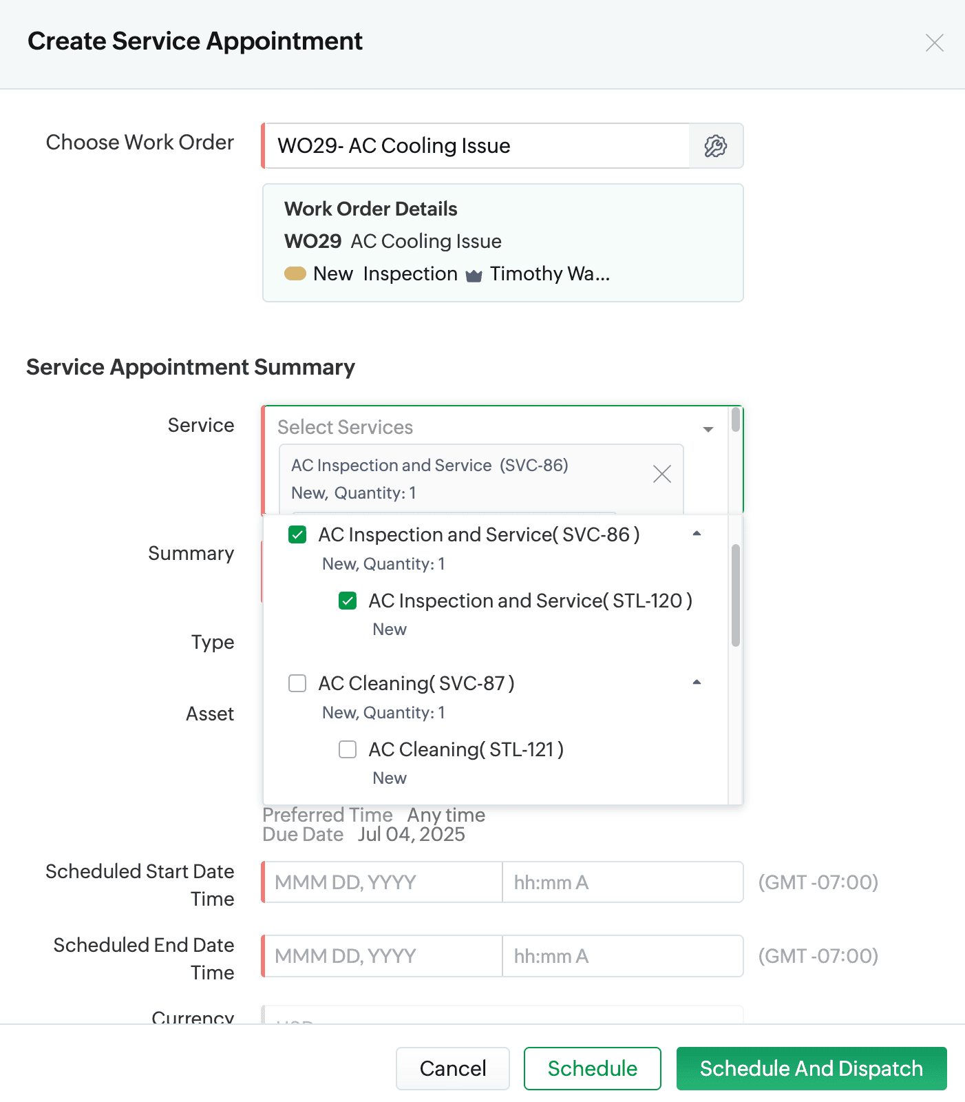 Yes, you can schedule a single service appointment that covers all services in a Work Order — as long as no appointments already exist for the individual service line items. To create a service appointment : Go to: Work Order Management > Service ...