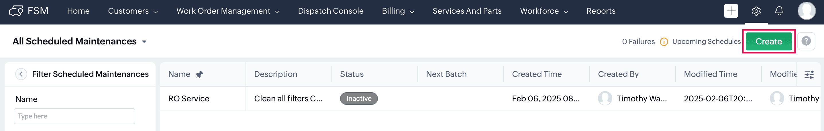 1. Go to Work Order Management > Scheduled Maintenances and click Create