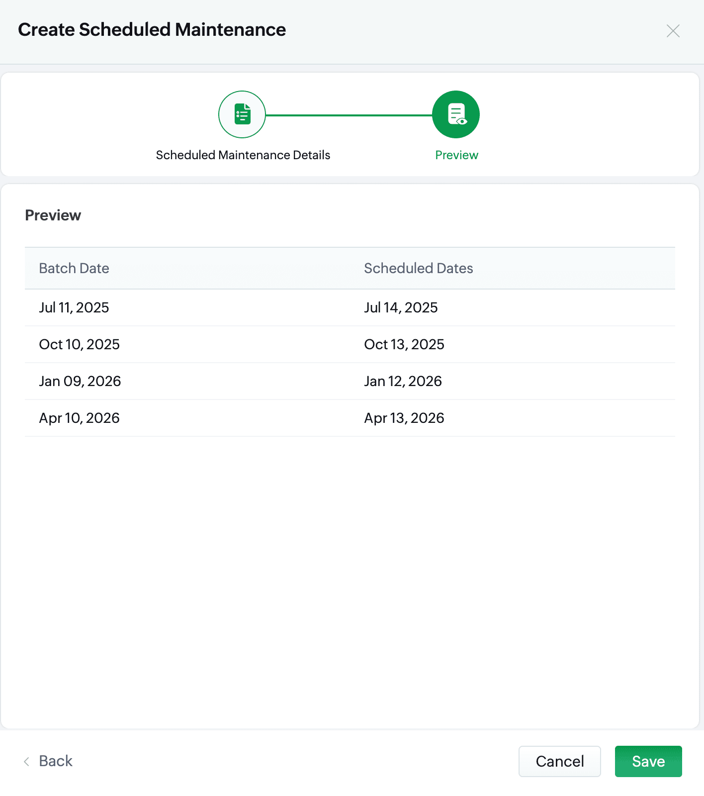 7. Click Next to view the scheduled dates and creation (batch) dates