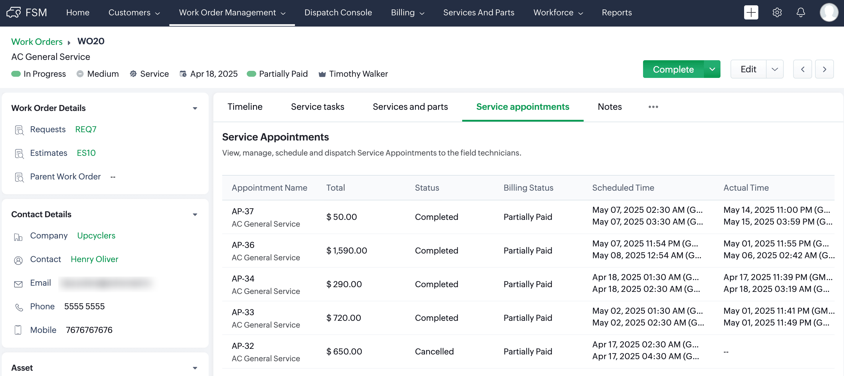Yes, in Zoho FSM, you can easily view all service appointments linked to a work order.